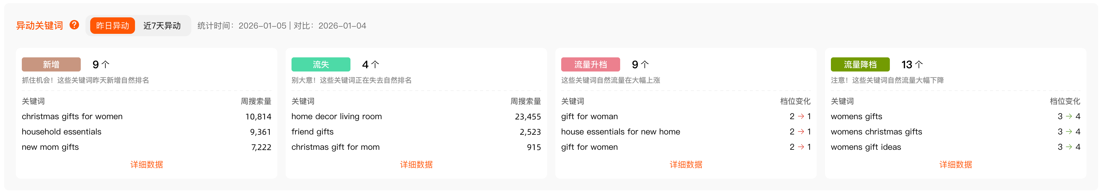 【实战场景:加速流量孵化】 周二早上,您在「昨日异动」的“新增”模块下发现了3个关键词。这意味着您的ASIN昨天首次获得了这3个词的自然排名。