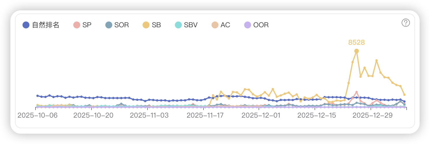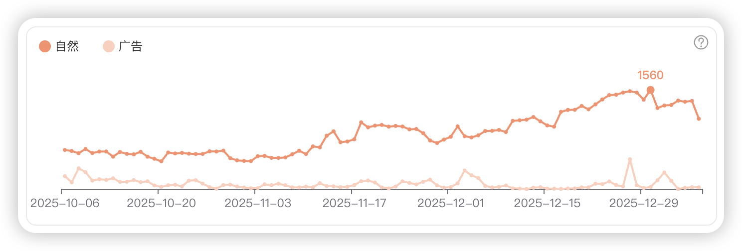 自然 vs 广告词量:对手是在悄悄加大广告投入,还是其自然排名的关键词池在稳步增长?通过对比两条曲线,您可以判断其广告策略是否有效孵化了更多自然词。