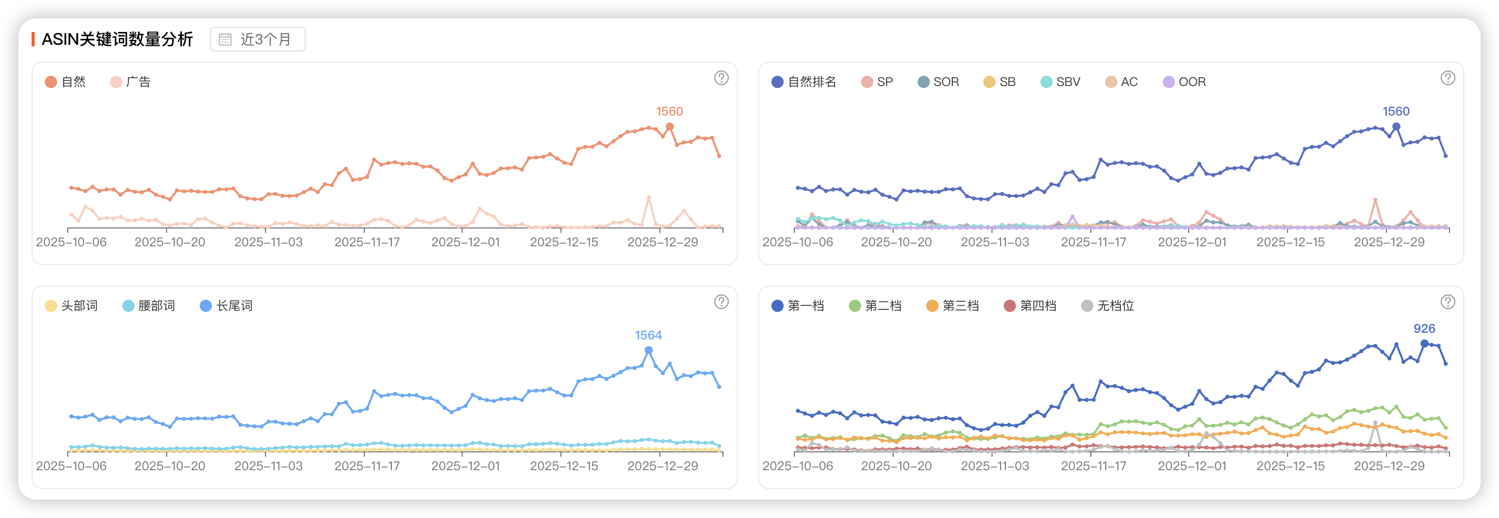 自然-广告 关键词数量趋势:对手是在悄悄加大广告投入,还是其自然排名的关键词池在稳步增长?通过对比两条曲线,您可以判断其广告策略是否有效孵化了更多自然词。