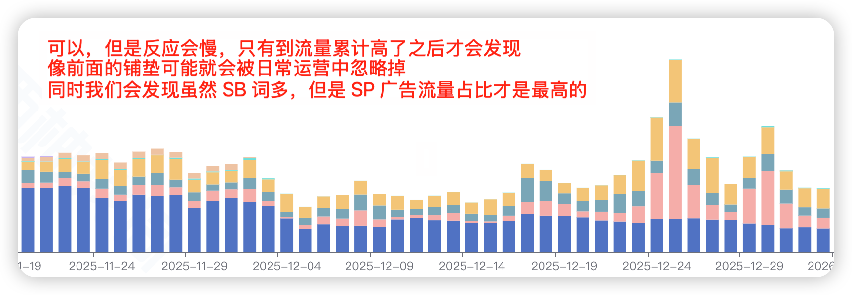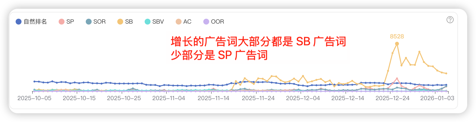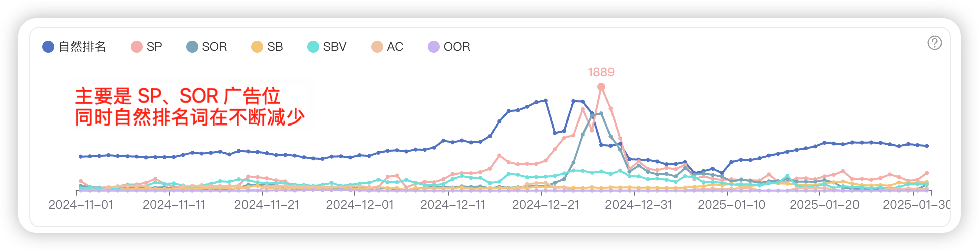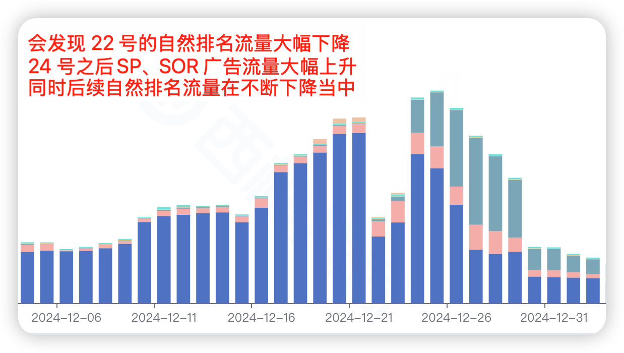 结论: 我们成功还原了历史的全貌——去年12月22日,该竞品很可能因断货、差评或被攻击等原因,丢失了大量核心自然排名,陷入危机。为了自救,他们立刻采取了防守反击策略:猛砸SP和SOR广告,用广告流量强行填补自然流量的巨大缺口,避免崩盘。