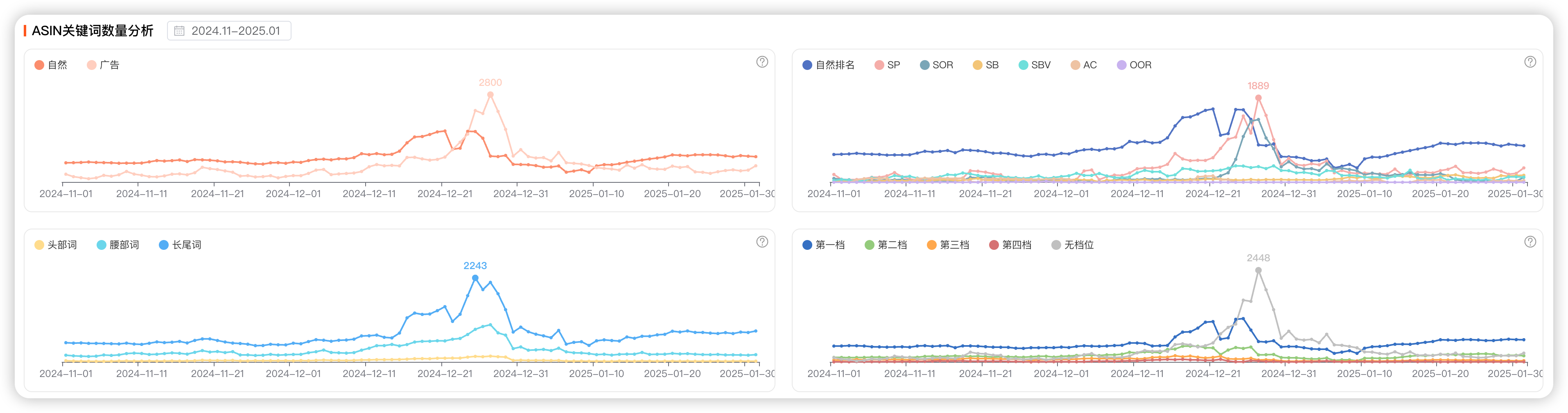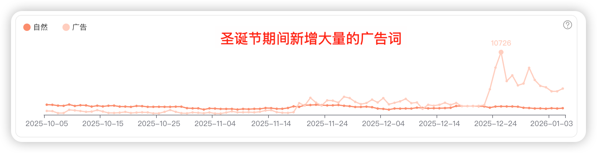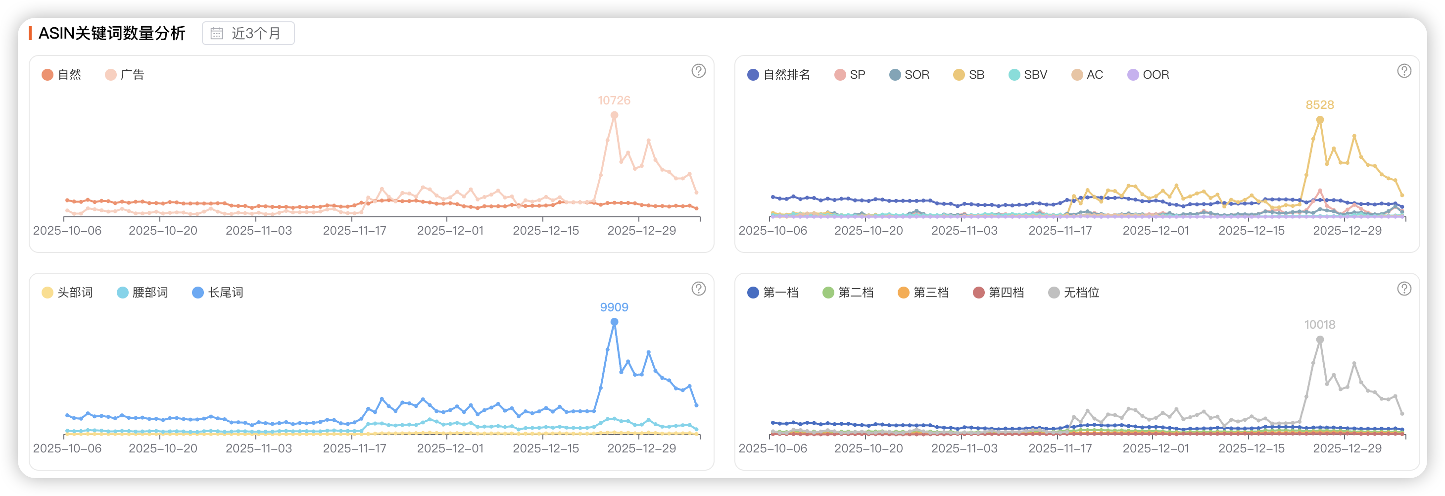 结论: 一个清晰的策略浮出水面——在圣诞节流量高峰前,您的对手通过SB广告,使用海量、低成本、此前无自然排名的长尾词,进行大规模的流量测试和收割。「关键词数量分析」让您提前数周就洞察了对手的完整策略布局。