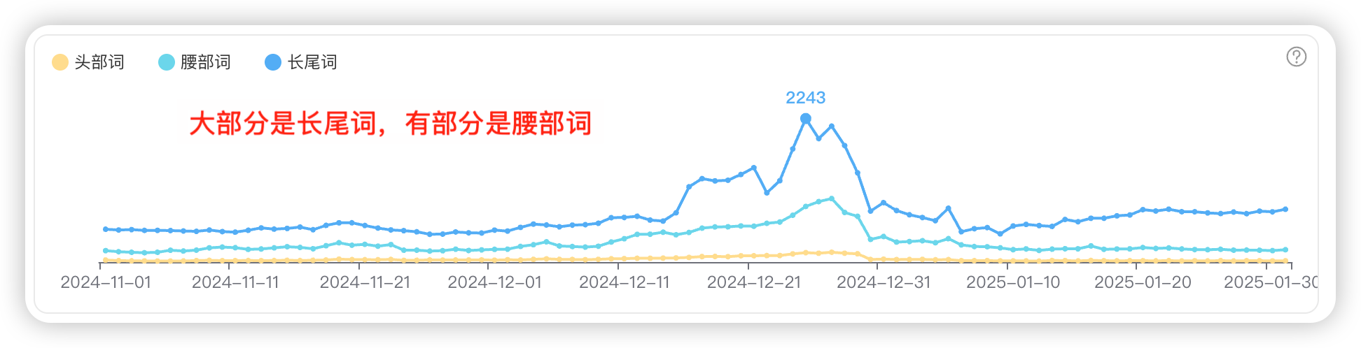 答: 大部分是长尾词,也有部分腰部词(见左下图,蓝色线条暴涨)。