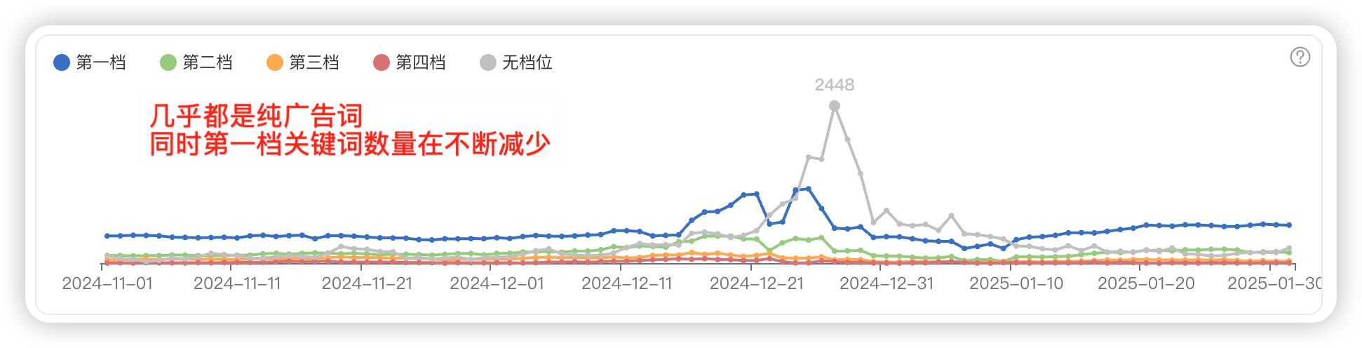 答: 广告词数量在12月23日左右出现了爆发式增长。早在 11 月中旬我们就会发现广告词在缓慢的增长。(见左上图,粉色线条)