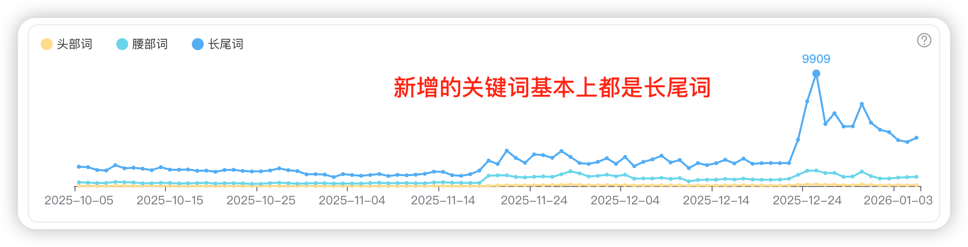 头/腰/尾 关键词数量趋势:他是在巩固头部大词的护城河,还是在用海量长尾词进行低成本的广泛测试?
