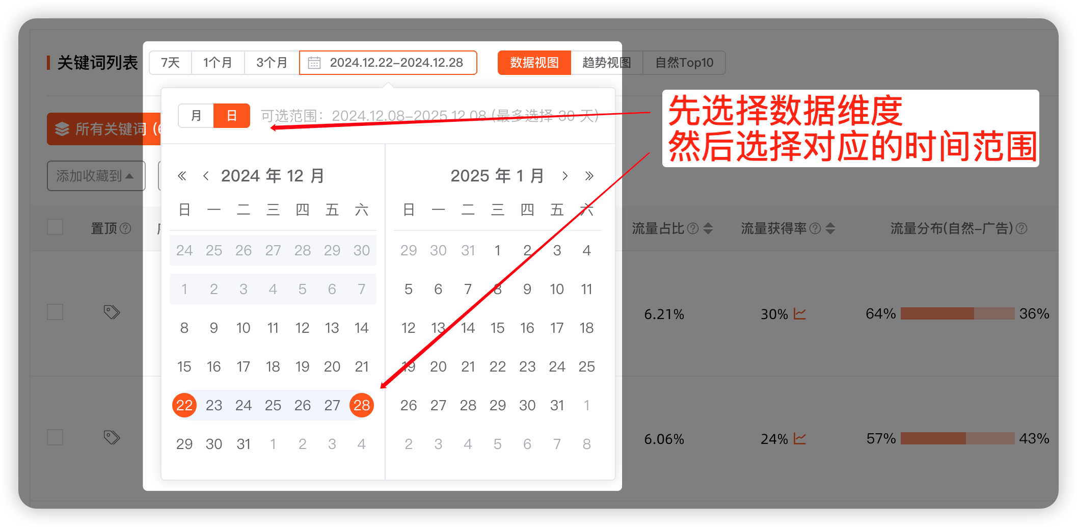 接下来,进入关键词列表。点击新增的“自定义”按钮,选择“日维度”,并将时间范围精准锁定在去年圣诞节那一周。