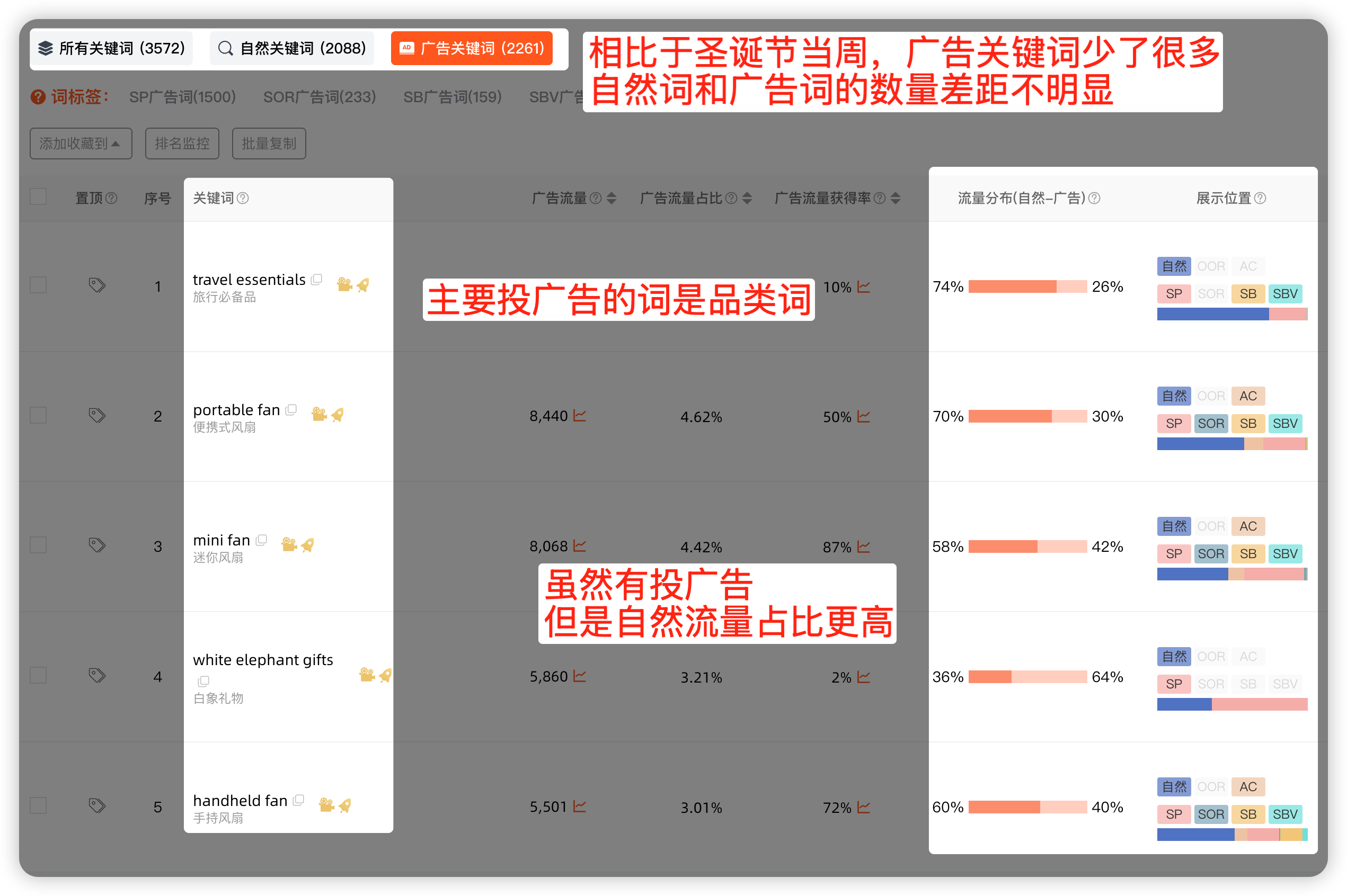 - 节前一周:虽然有投广告,但自然流量占比更高,主要靠品类词的自然排名获取流量。