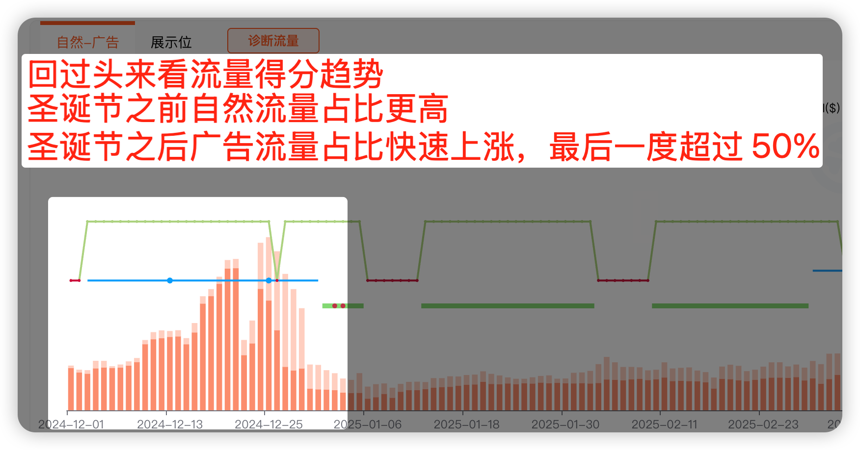 - 圣诞节开始后:广告流量占比快速上涨,一度超过 50%(靠砸钱)。