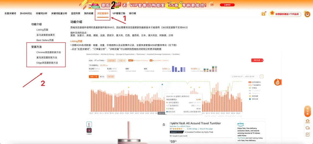 大家可以更新最新版的西柚浏览器插件,进入Listing页面中即可马上查看对应ASIN的销量、流量、价格趋势以及运营事件记录,快速洞察ASIN销量和流量,全面掌握ASIN的整体情况。