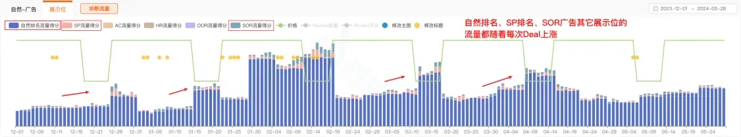 接下来,我们进入到展示位流量趋势再进一步看看降价具体带动了这个ASIN哪部分流量上涨。