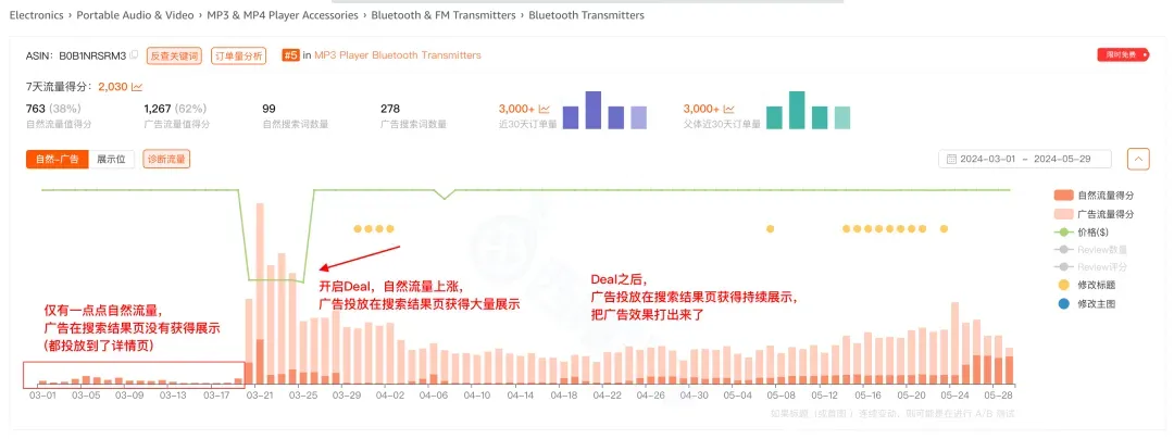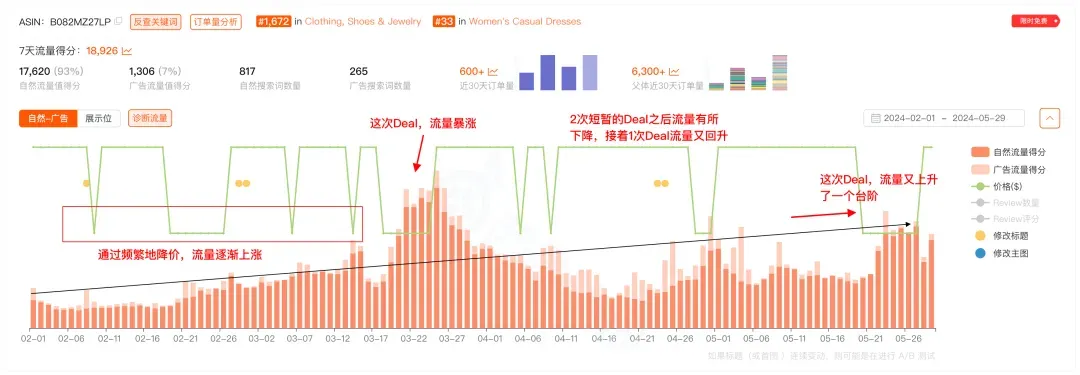 从图中红色箭头指的几个时间段可以发现,这个ASIN都有在频繁做降价促销,但是广告流量占比很低,而在图中箭头所指这些时间段内,它的自然流量都随着降价促销上涨。