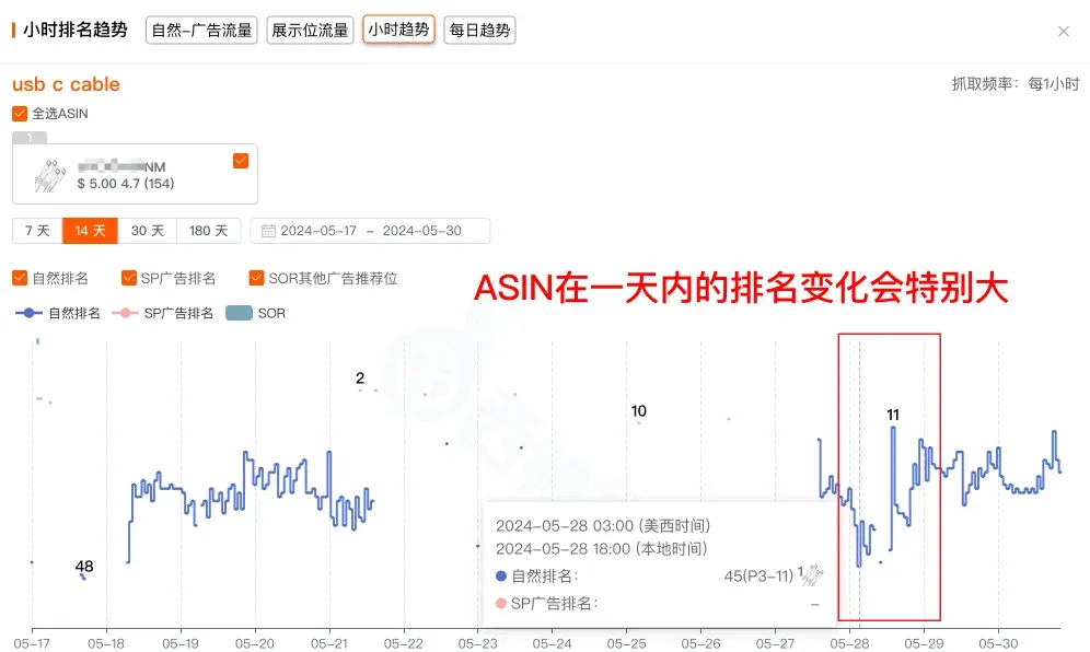 看一下西柚找词的小时级排名就可以知道,ASIN 在一天内不同时间的排名变化会特别大。