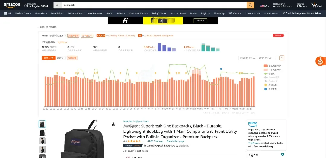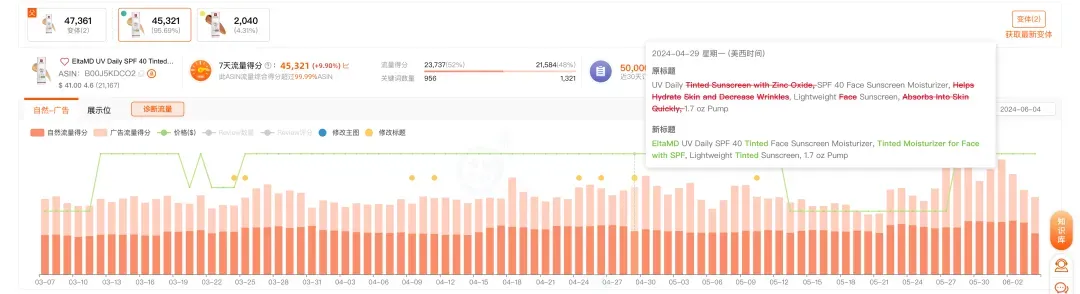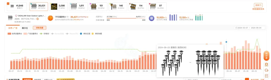 为了尽可能完整地呈现影响流量的因素,我们除了呈现价格的变化,还加入了修改主图和标题的运营动作记录(接下来还将加入更多运营活动的记录),让大家能够更准确的判断出导致ASIN流量变动的原因。