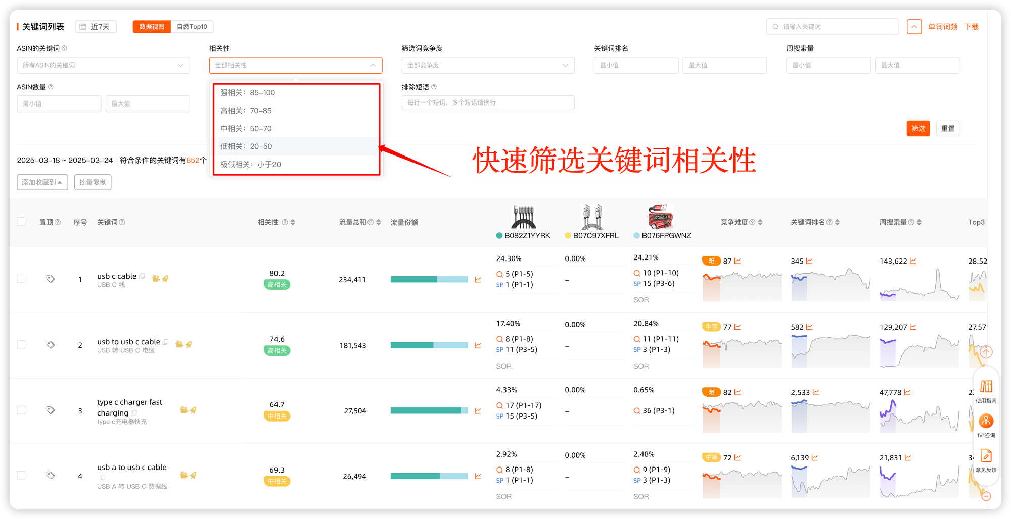 点击“单词词频”旁的下拉框,点击“相关性”,勾选强相关、高相关、中相关关键词,可快速进行关键词相关性筛选。