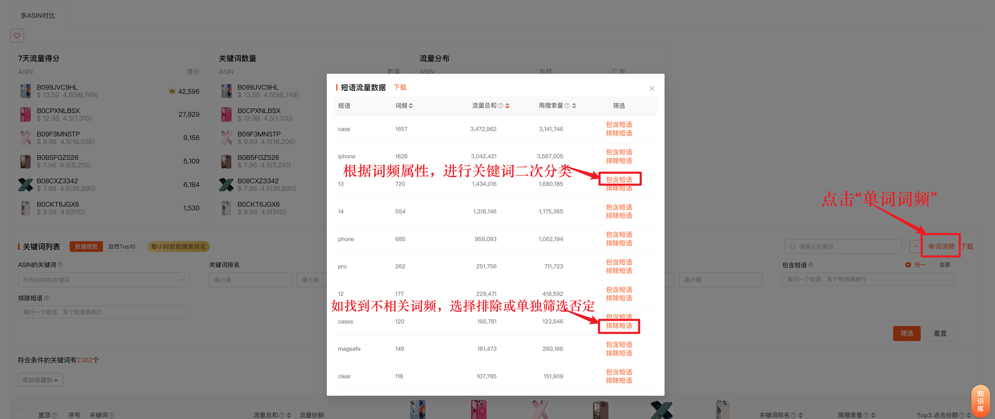 针对单词词频中出现的不相关词频,我们可以选择“排除短语”或选择单独筛选出来在后台进行否定,提前避免广告费空烧的情况。