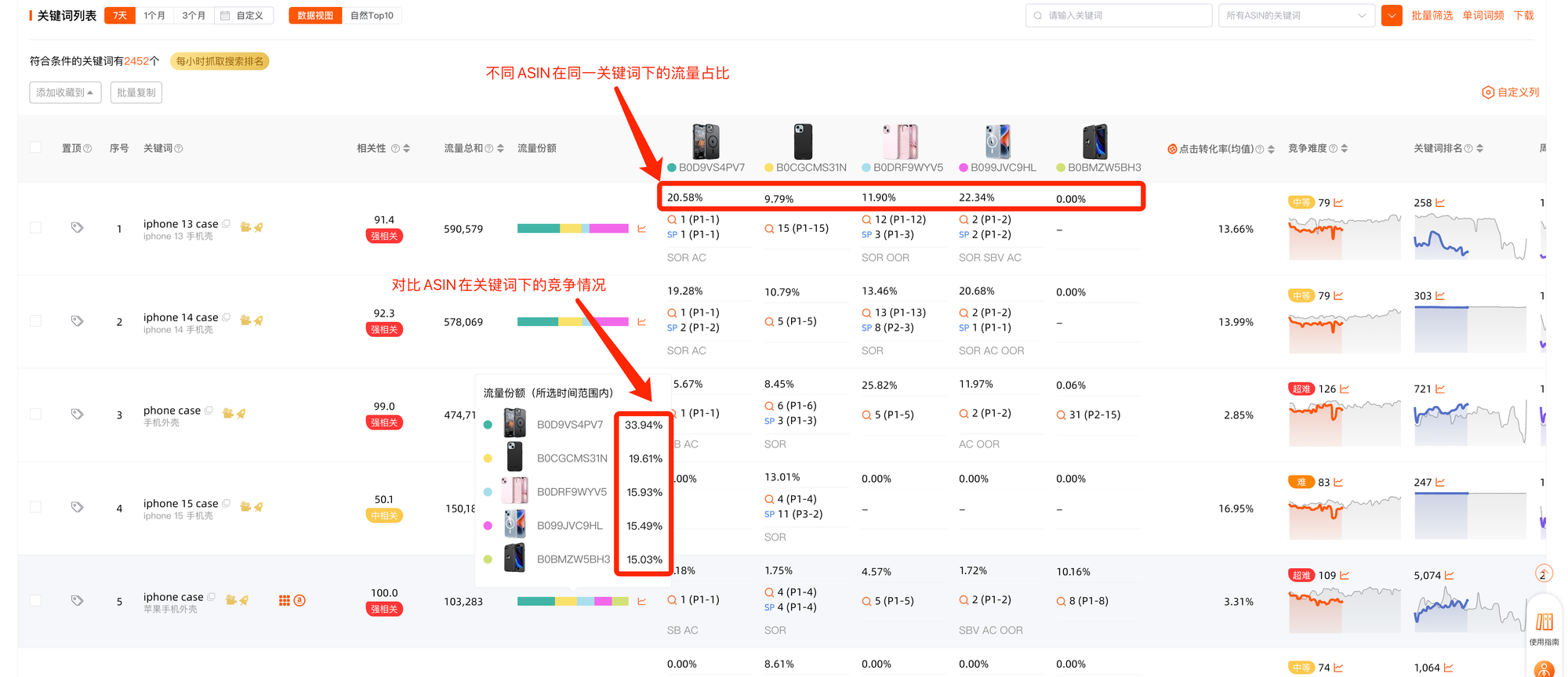 2、流量占比:快速了解到该关键词是否为ASIN的主推词或者主要流量来源词,由此可以分析不同ASIN的主要侧重词为哪些,判断竞争对手的关键词流量差异结构是什么样子的。