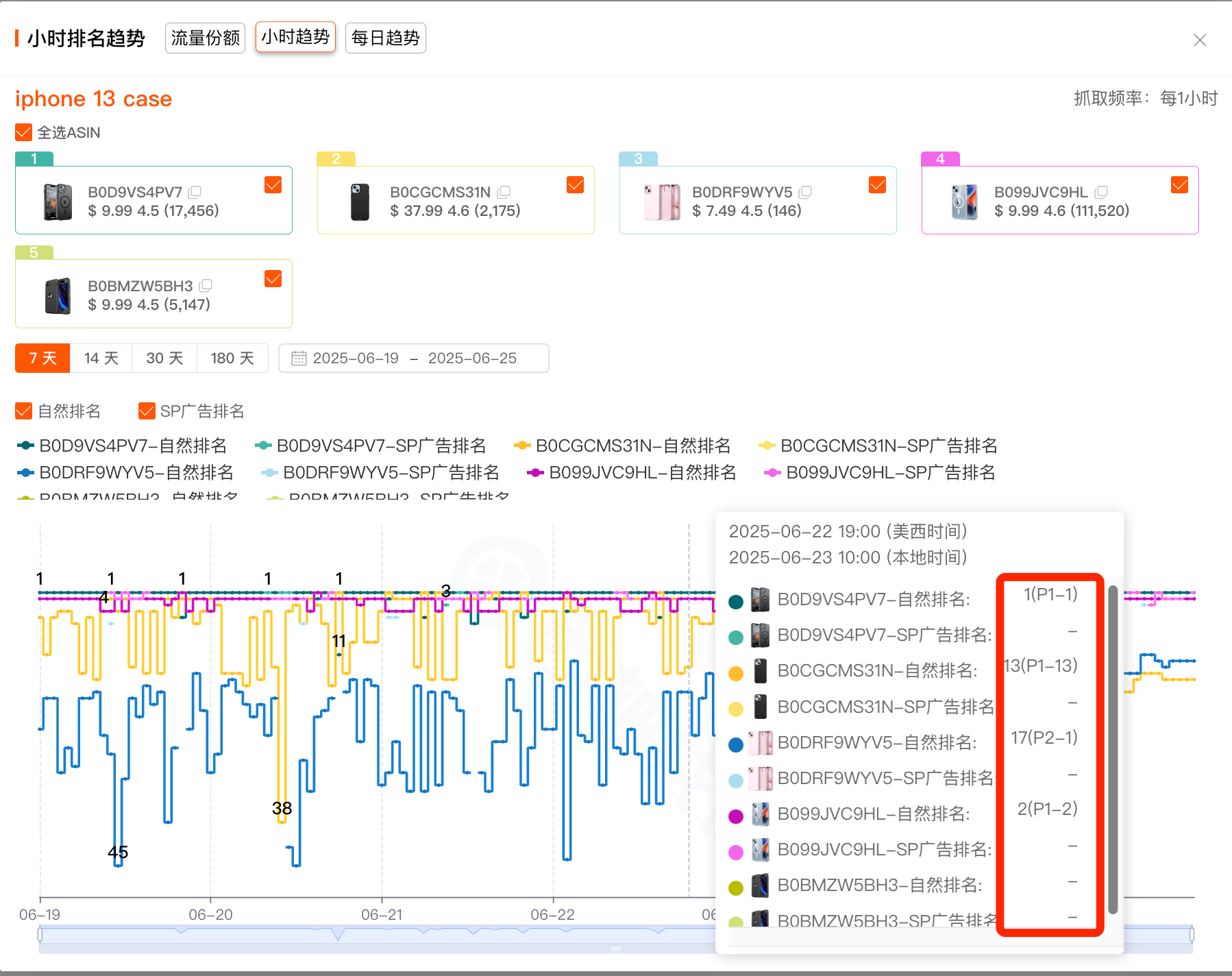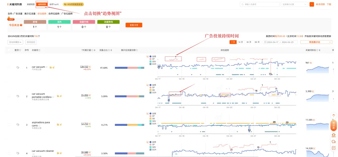 在“关键词反查”页面中,切换“趋势视图”,我们能够快速看到ASIN在各个关键词下的排名变化情况,我们能够看到竞争对手在关键词下广告投放持续的时间,自然排名的增长变化,以及是否有相应的广告投放策略。