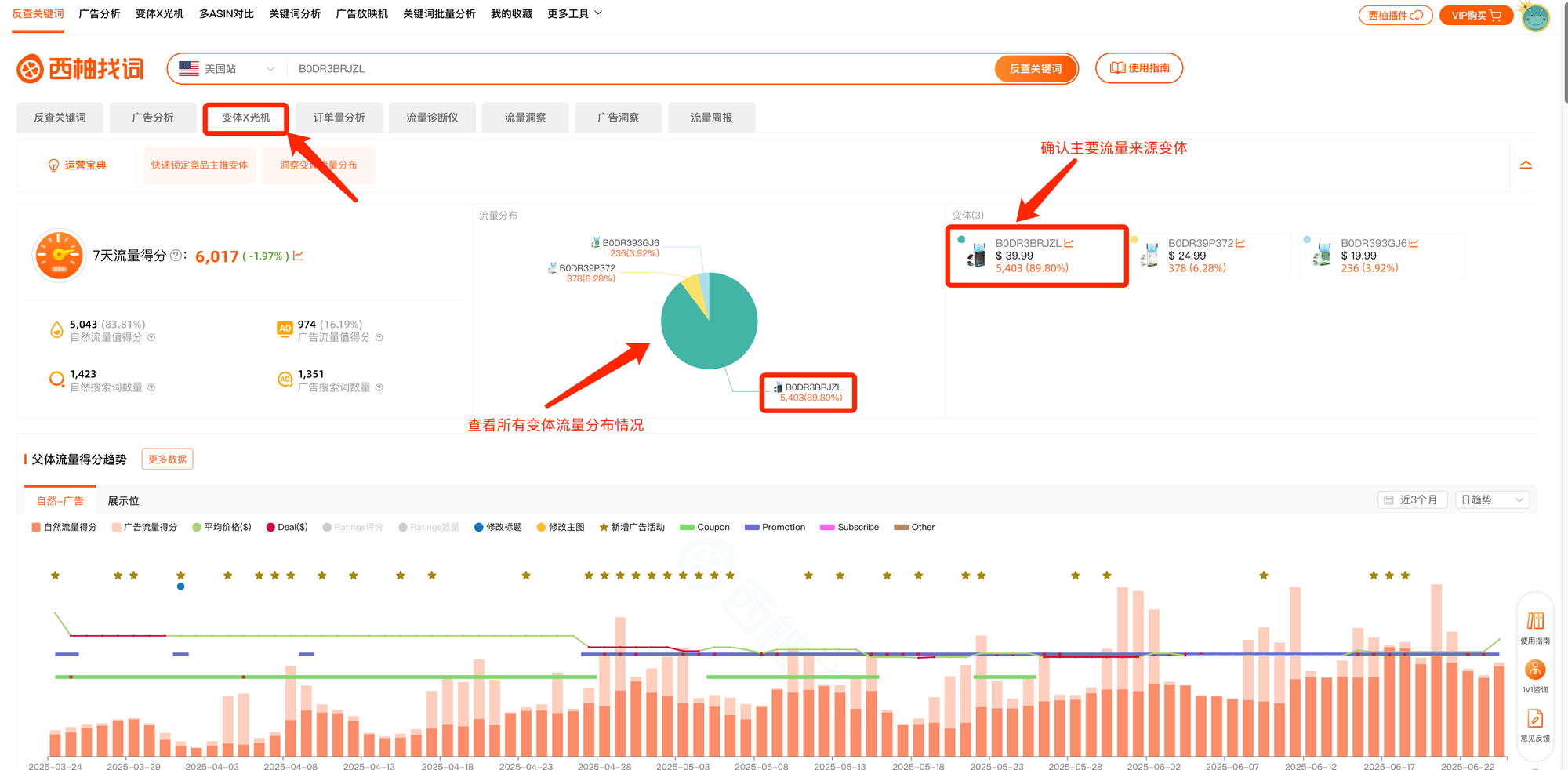 如果想要单独针对竞品ASIN进行分析,首先可以通过“变体X光机”确认该变体是否为该父体下最大流量来源变体,通过流量最大的变体来分析更加具有参考性。