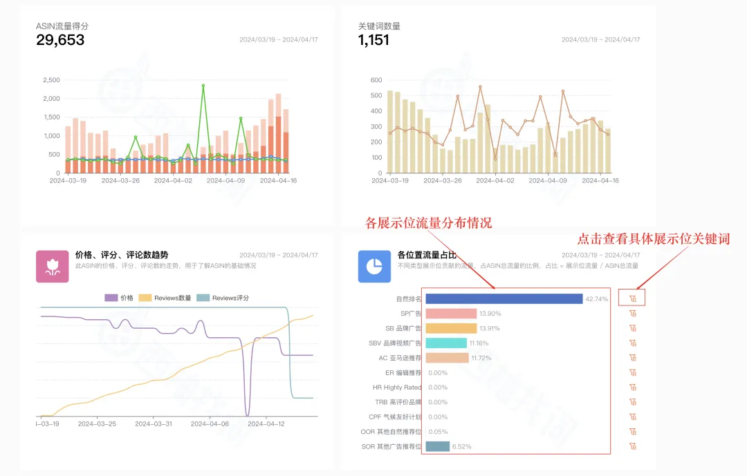 “各位置流量占比”:直接ASIN在相应展示位下对应的关键词有哪些。快速找到相应展示位下的关键词。