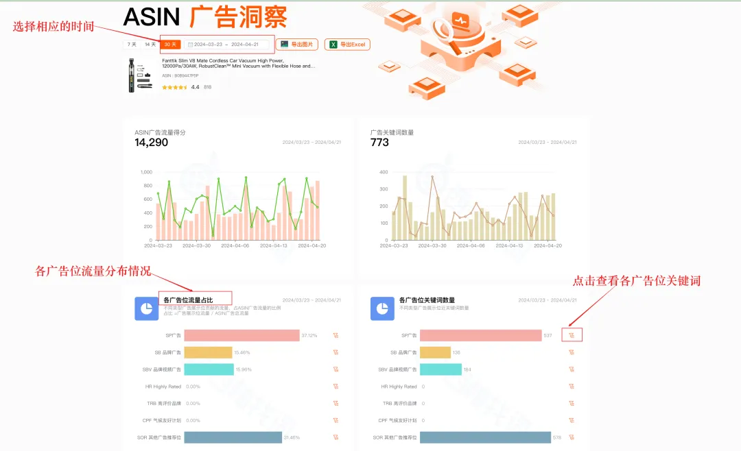 我们可以点击反查ASIN,进入“流量洞察”页面,我们可以快速针对ASIN流量进行分析,分析竞品主要流量来源,以及竞品ASIN头部词、腰部词以及长尾词数量贡献的展示量情况。