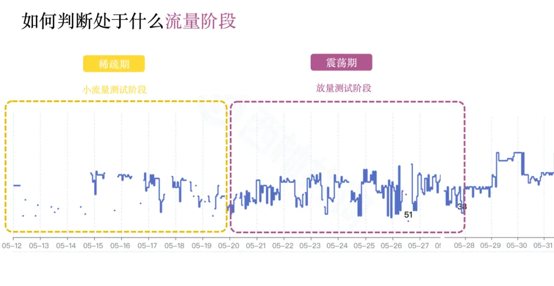 进一步测试在哪个位置的表现比较好,如果在震荡期表现优秀,则会获得一个靠前的稳定排名。如果在这个阶段表现不尽如人意,那么流量又会回收,持续在震荡期徘徊,或者掉入稀疏期。
