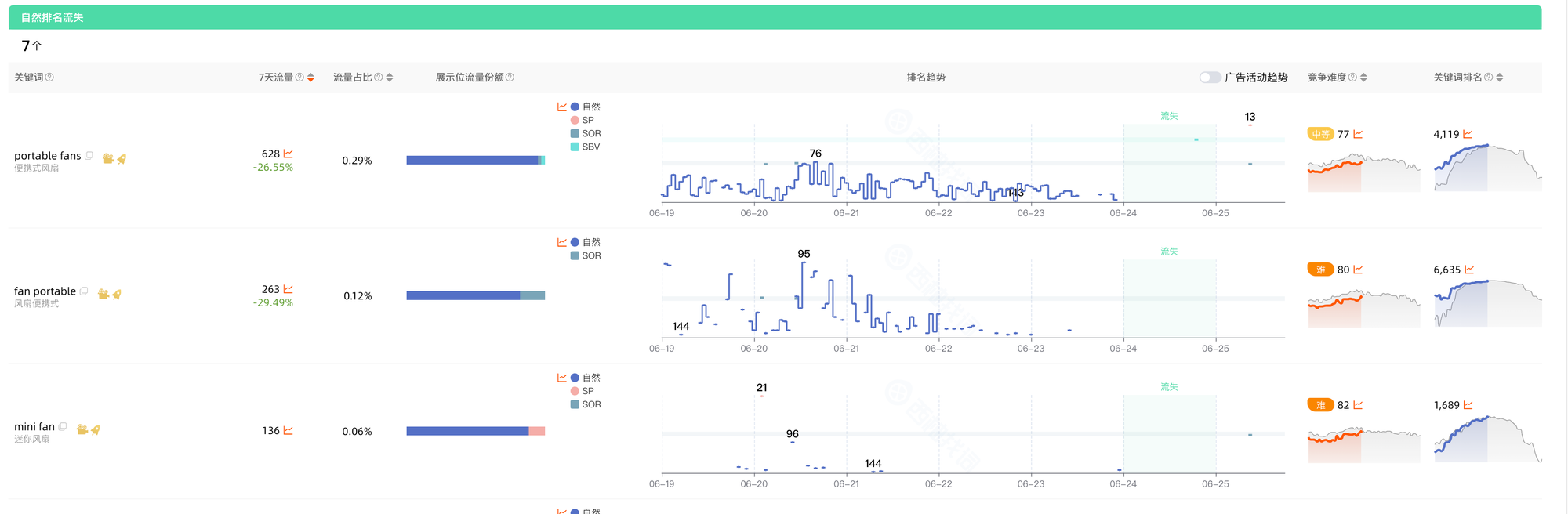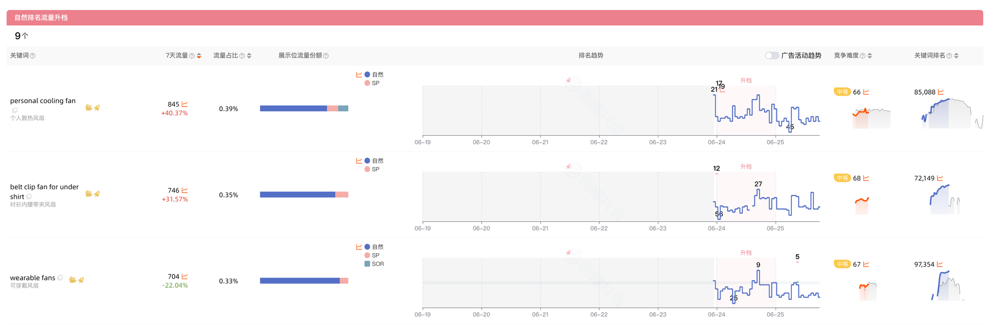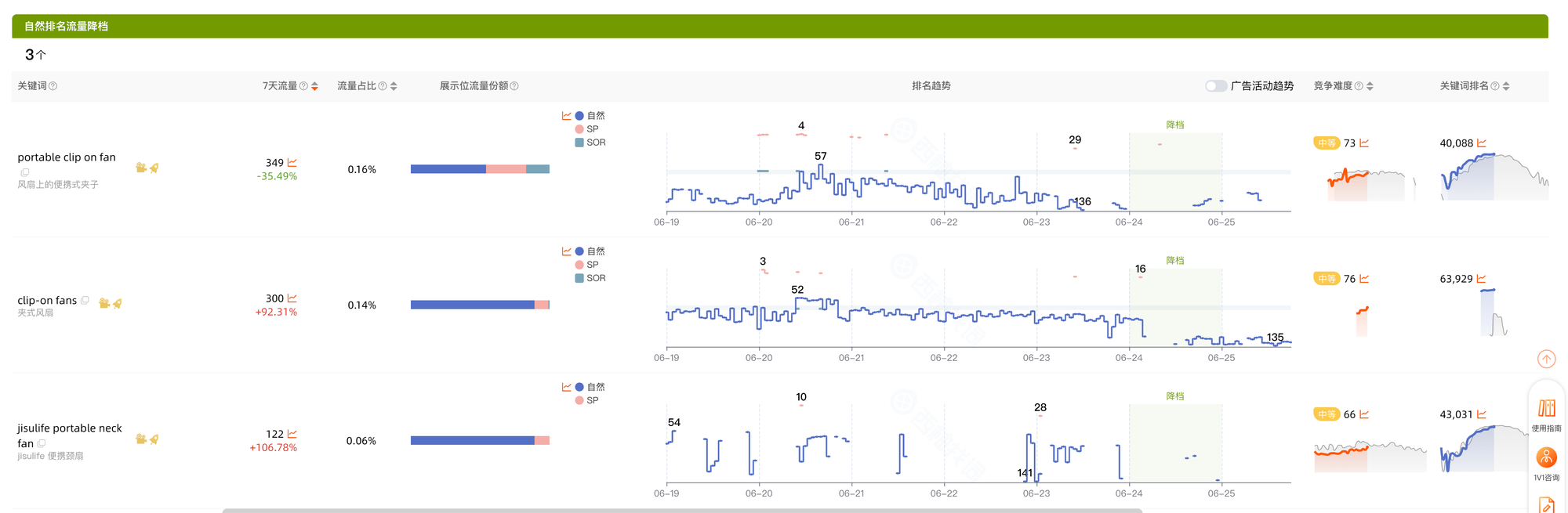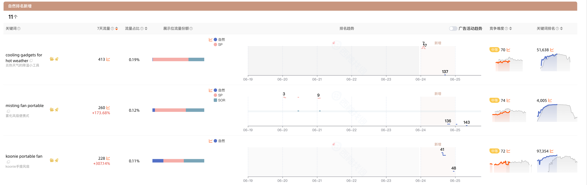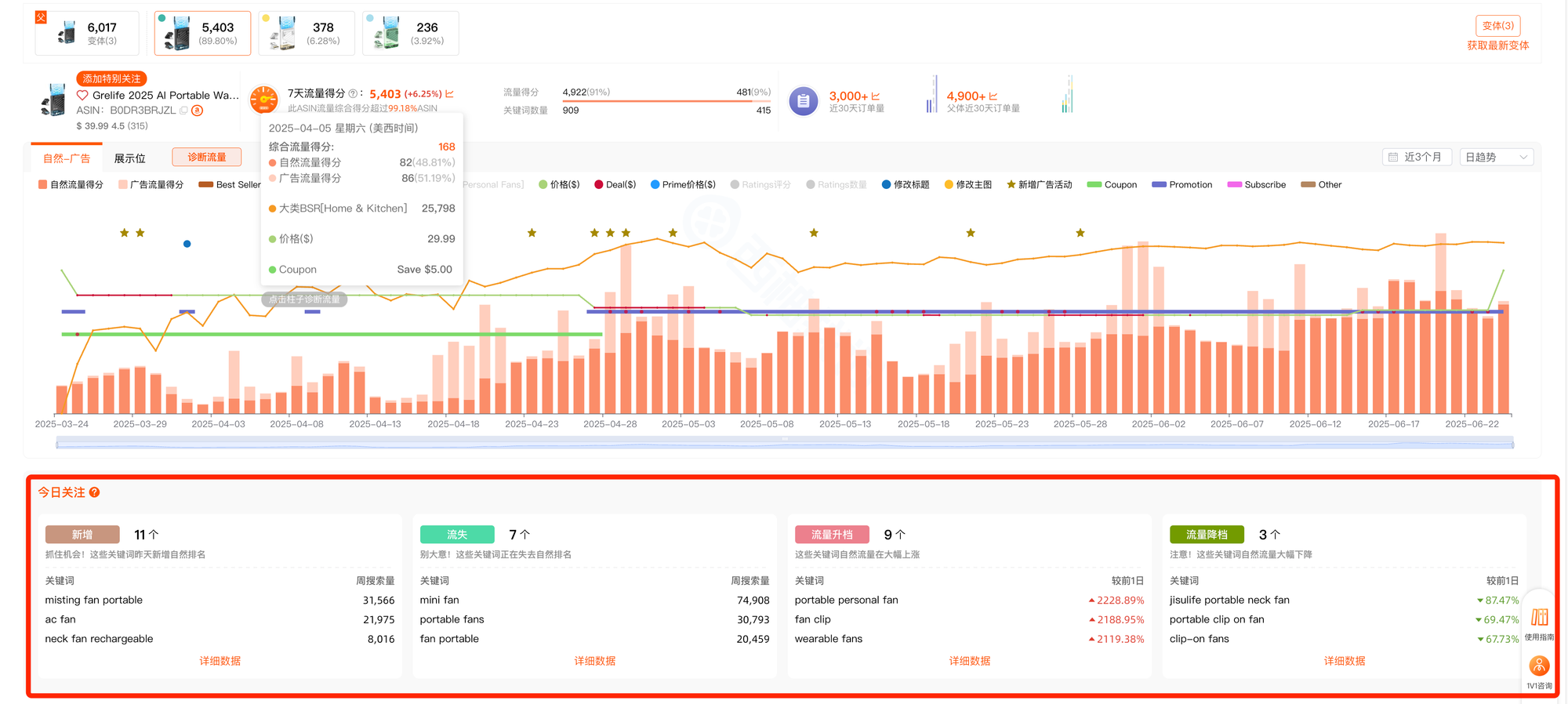 为了帮助我们更加精准地捕捉到产品的流量机会以及潜在流失风险,及时调整策略,更加有效地把握住窗口期。“今日关注”提供了4个维度数据,自然排名“新增”、“流失”、“流量升档”、“流量降档”。