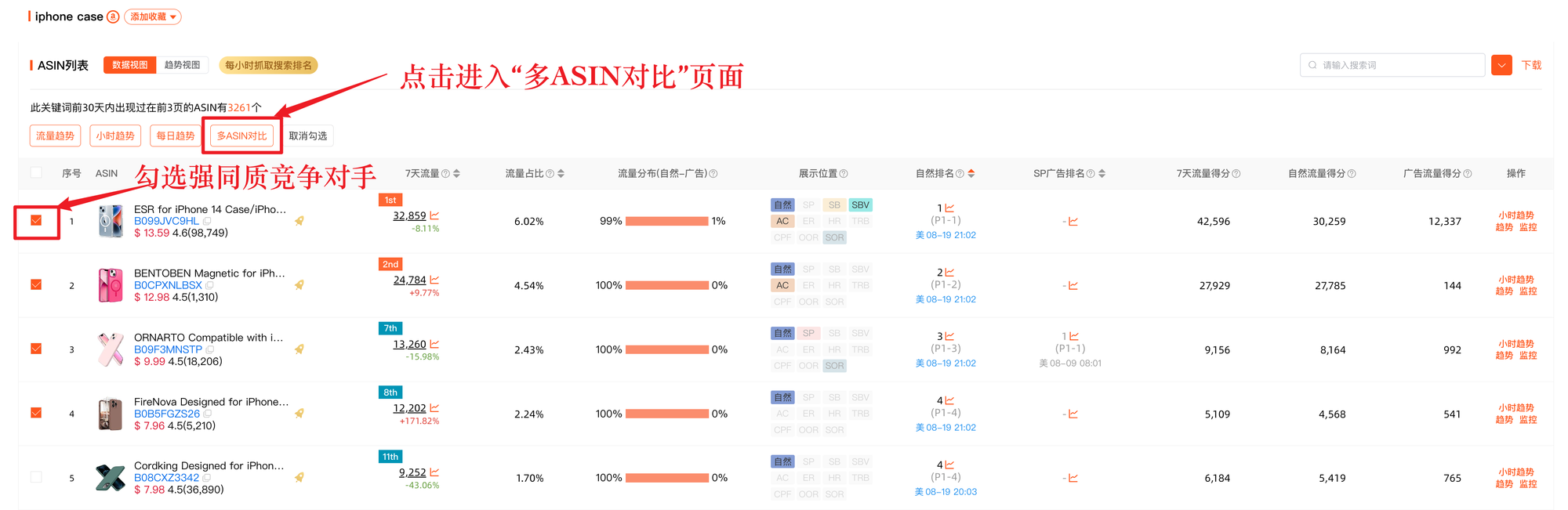 在进行竞品分析之前,我们需要首先需要找到一批和自己当前强同质的产品,批量放入“多ASIN对比”中,多ASIN对比能够帮助我们从各数据指标进行竞品全面对比分析,从而找到关键词覆盖差异情况。