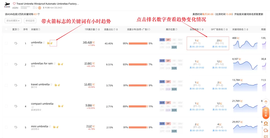 在关键词后面带有“🚀”火箭标志的,都是我们拥有小时级排名趋势的关键词,也就是我们会1个小时抓取1次关键词搜索结果页中的排名数据,并进行更新。
