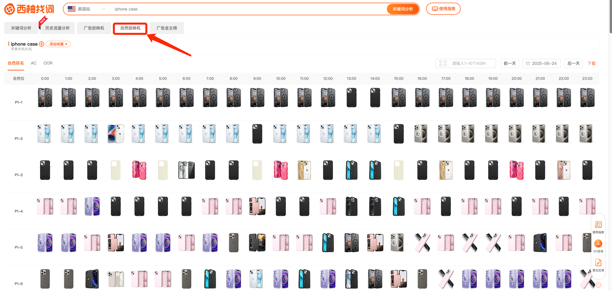 在自然放映机中, 我们能够看到每小时自然位置上的ASIN都是哪些。我们能够知道ASIN自然排名越靠前,自然排名越稳定。