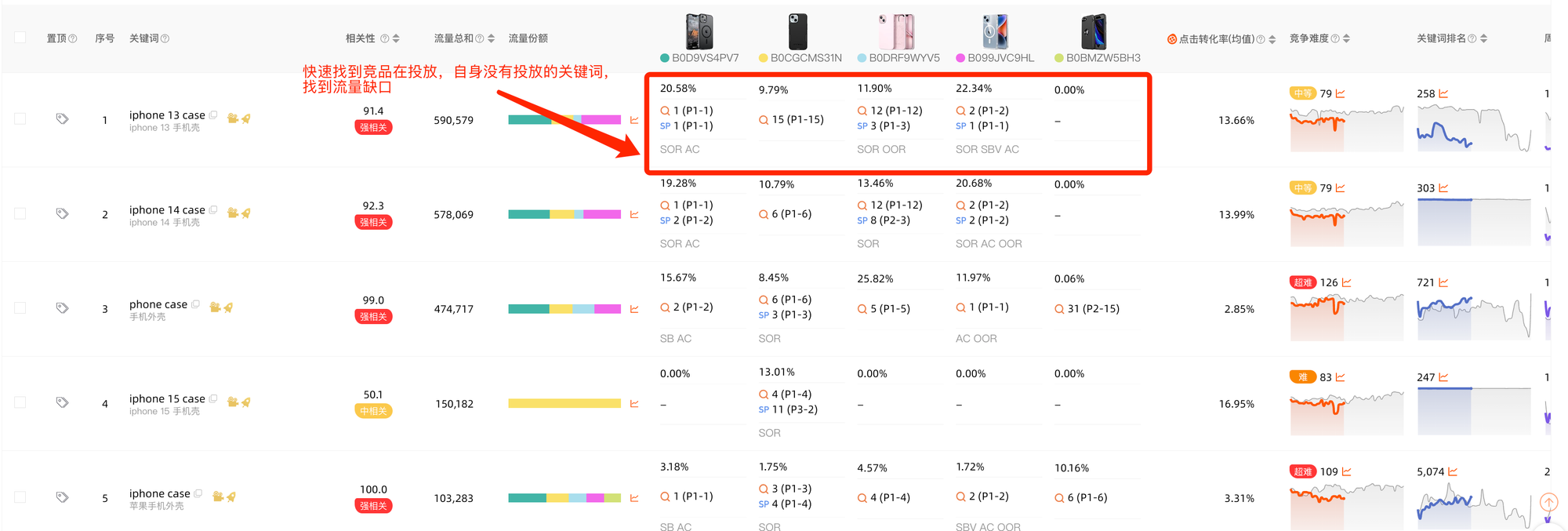 通过查看对比ASIN在关键词下的排名表现情况,可以快速找到竞争对手有自然排名或者进行广告投放的关键词,而我们自身没有排名的关键词,找到我们自身的流量缺口,进行补充。