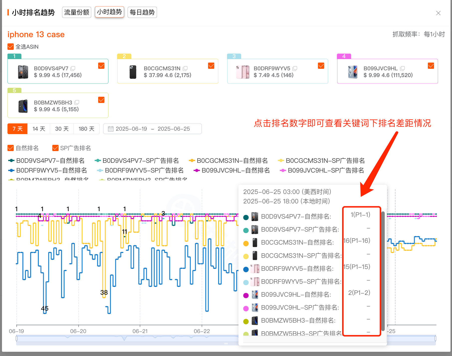 点击自然排名/广告排名数字,可看到各ASIN在同一关键词下的排名差距情况,找到流量突破点。