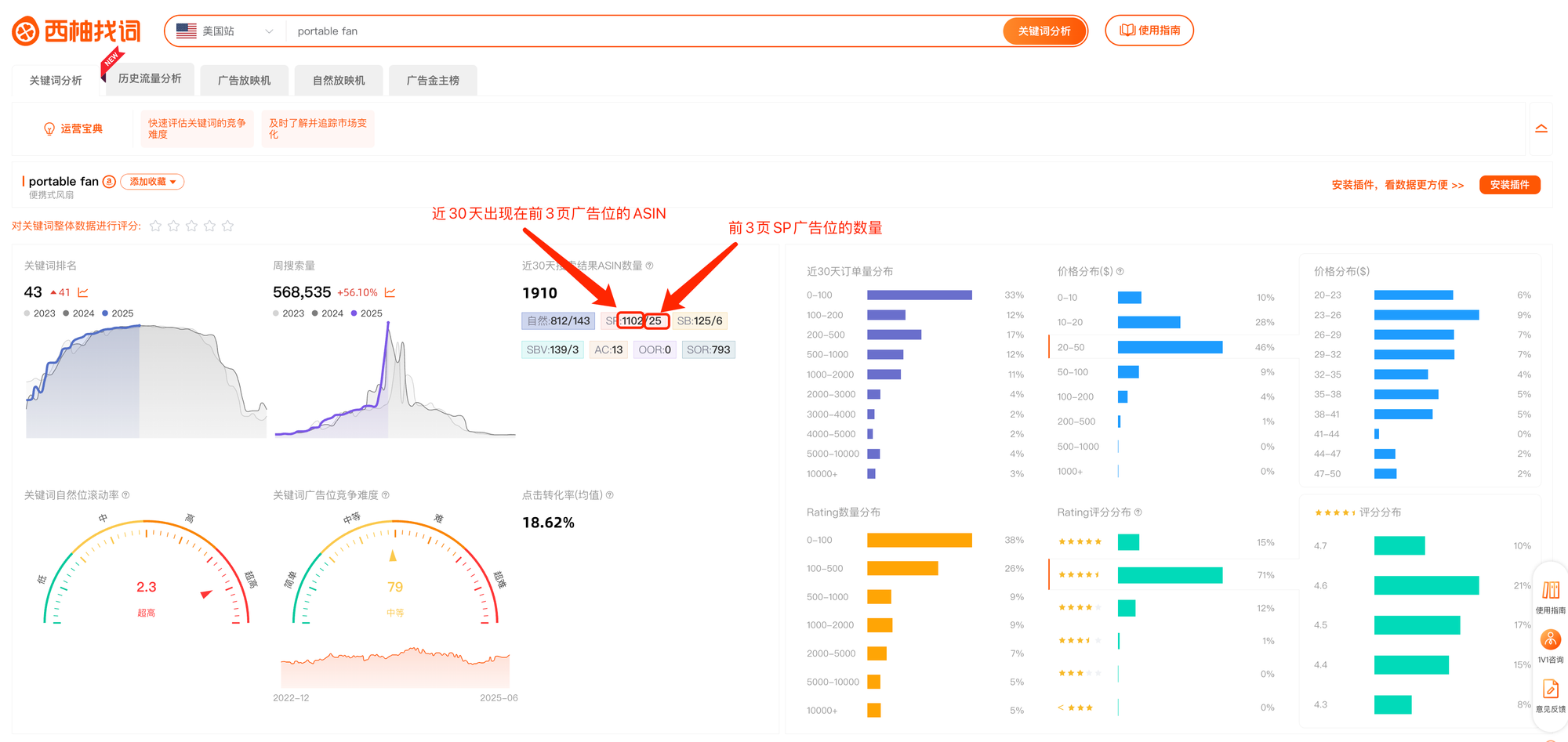 “搜索结果ASIN数量”:分子为此位置过去 30 天内出现过的 ASIN 数量,分母为此位置最近一次抓取时 的 ASIN 位数量。例:自然:368/48 指的是近 30 天内,有 368 个 ASIN 在竞争 48 个自然位,可以得知平均一个自然位有 7.6 个 ASIN 在竞争,由此来判断该关键词的一个竞争程度。