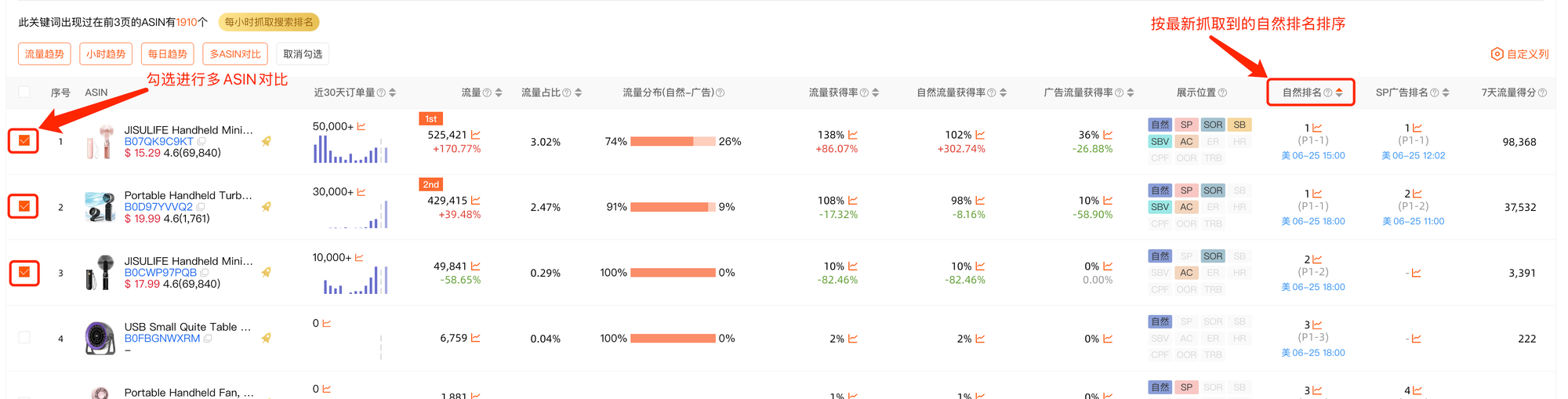 “多ASIN对比”:勾选ASIN前的方框,我们可直接将ASIN进行多ASIN对比。