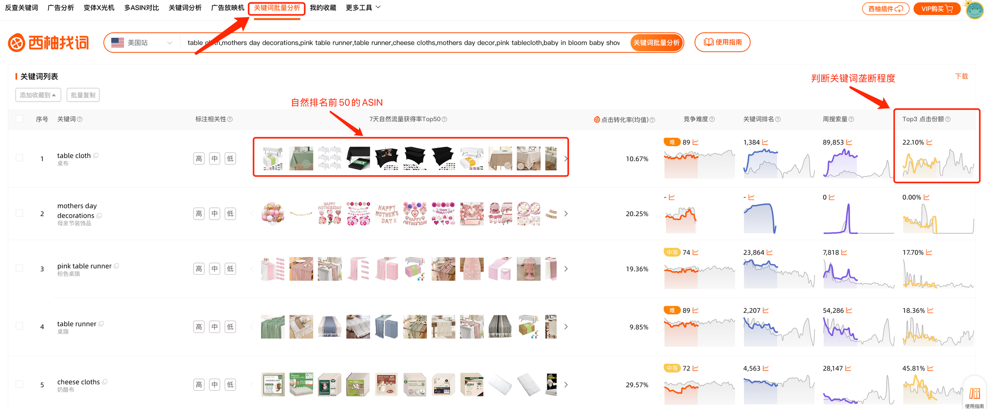 关键词批量分析可一次性直接输入10000个关键词进行分析,通过TOP10图片判断相关性以及关键词排名、周搜索量以及TOP3点击和转化以及TOP3ASIN,来判断关键词的市场情况以及垄断情况。