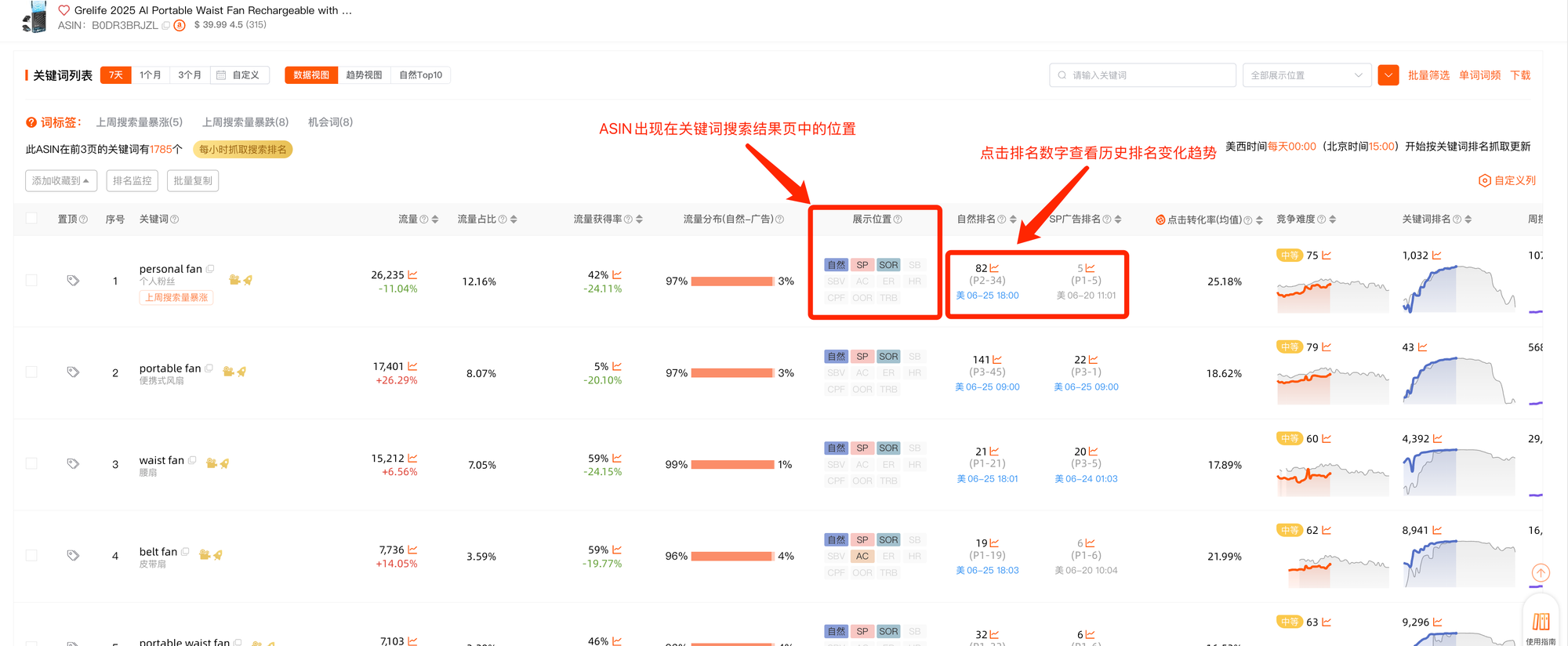 通过展示位置, 我们能够清楚地看到 ASIN出现在了哪些展示位置上,点击自然排名以及广告排名的数字,能够看到ASIN在关键词下自然排名以及广告排名的变化趋势,这能够帮助我们判断当前产品的推广状态以及广告投放效果。