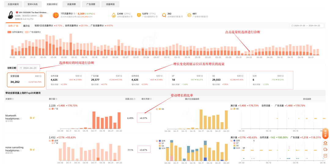 当ASIN出现异常流量变化情况时,我们可以通过“流量诊断仪”帮助更加深入的分析流量,从ASIN流量变化到关键词流量分析。