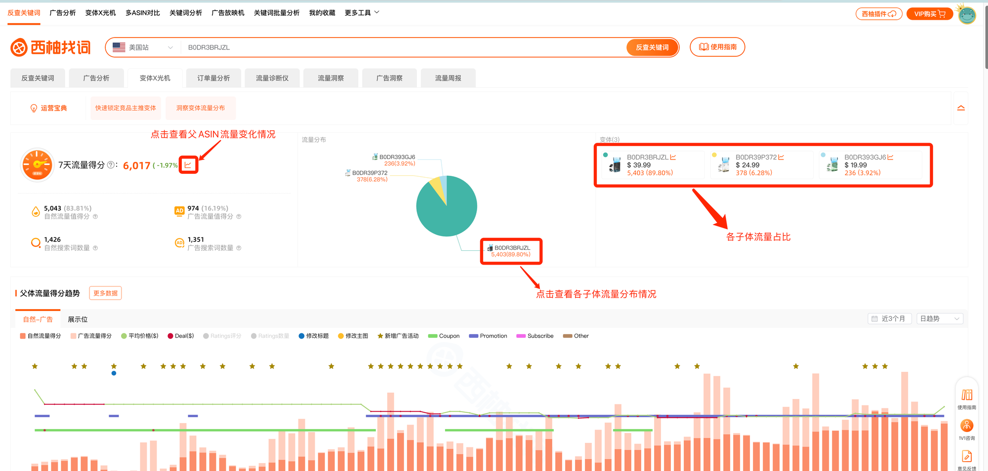 通过变体X光机,我们能够判断目前每个子体的流量分布情况,以及判断父体ASIN主推产品。