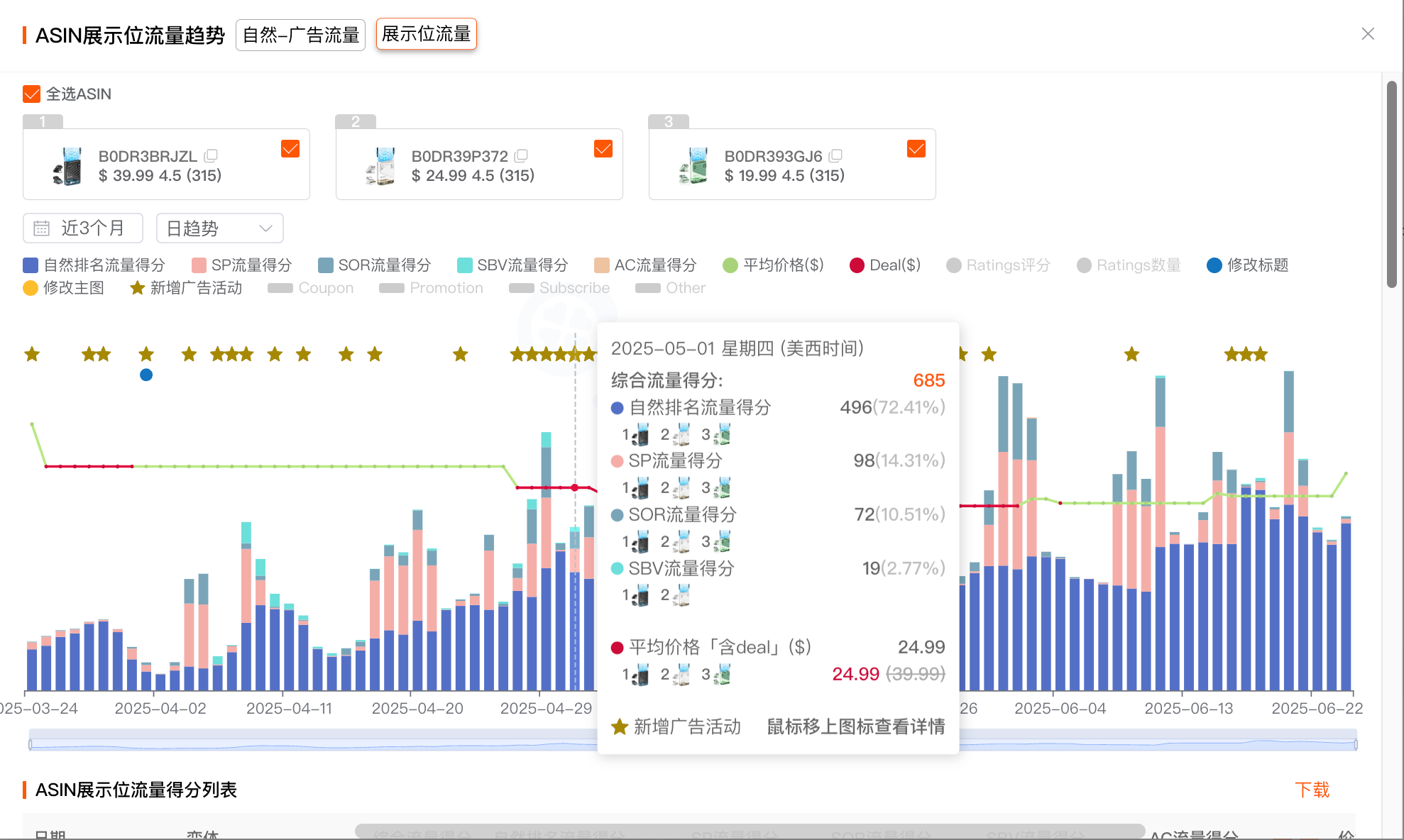 切换“展示位”趋势视图,能够快速了解当前 ASIN的流量来源于哪些展示位,主要流量来源来自哪里。