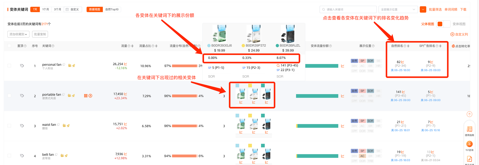 变体自然/广告排名: 点击变体关键词排名数字能够帮助判断变体广告排名展现集中情况,以及广告投放的集中程度。