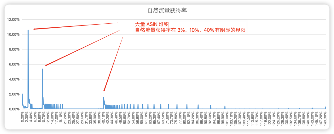 “分档”是怎么来的? 通过统计美国站 2月1日所有 ASIN 在所有关键词下 的自然流量获得率数据,经过大数据分析,我们发现自然流量获得率在 3%、10%、40% 这三个节点上会出现明显的层级断层。