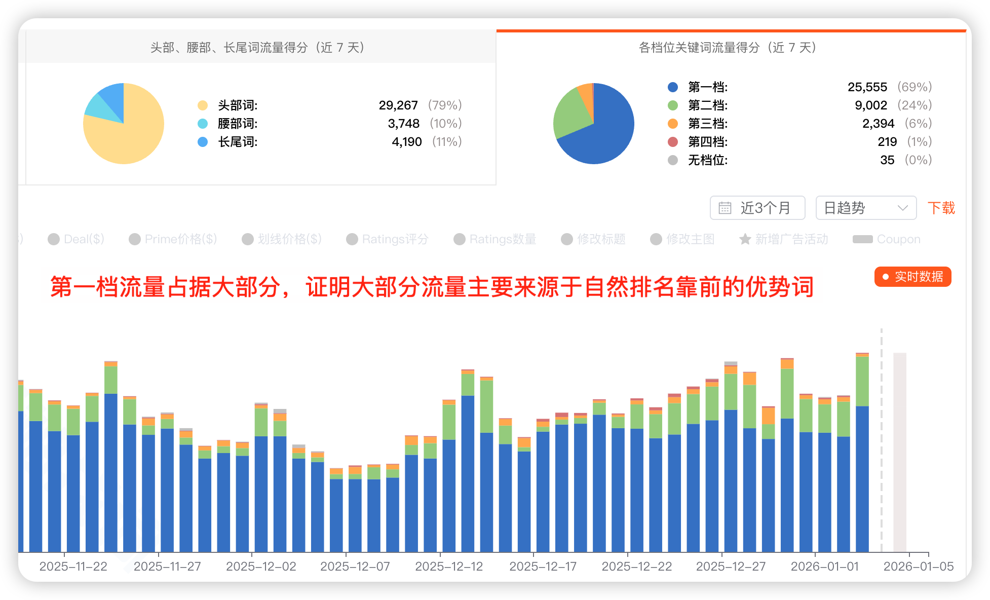 它强迫我们透过“关键词总数”的表象,去审视流量的有效性。请记住:好的运营,是在让流量得分上升(柱子变高)的同时,让自然表现变强(柱子变蓝)。