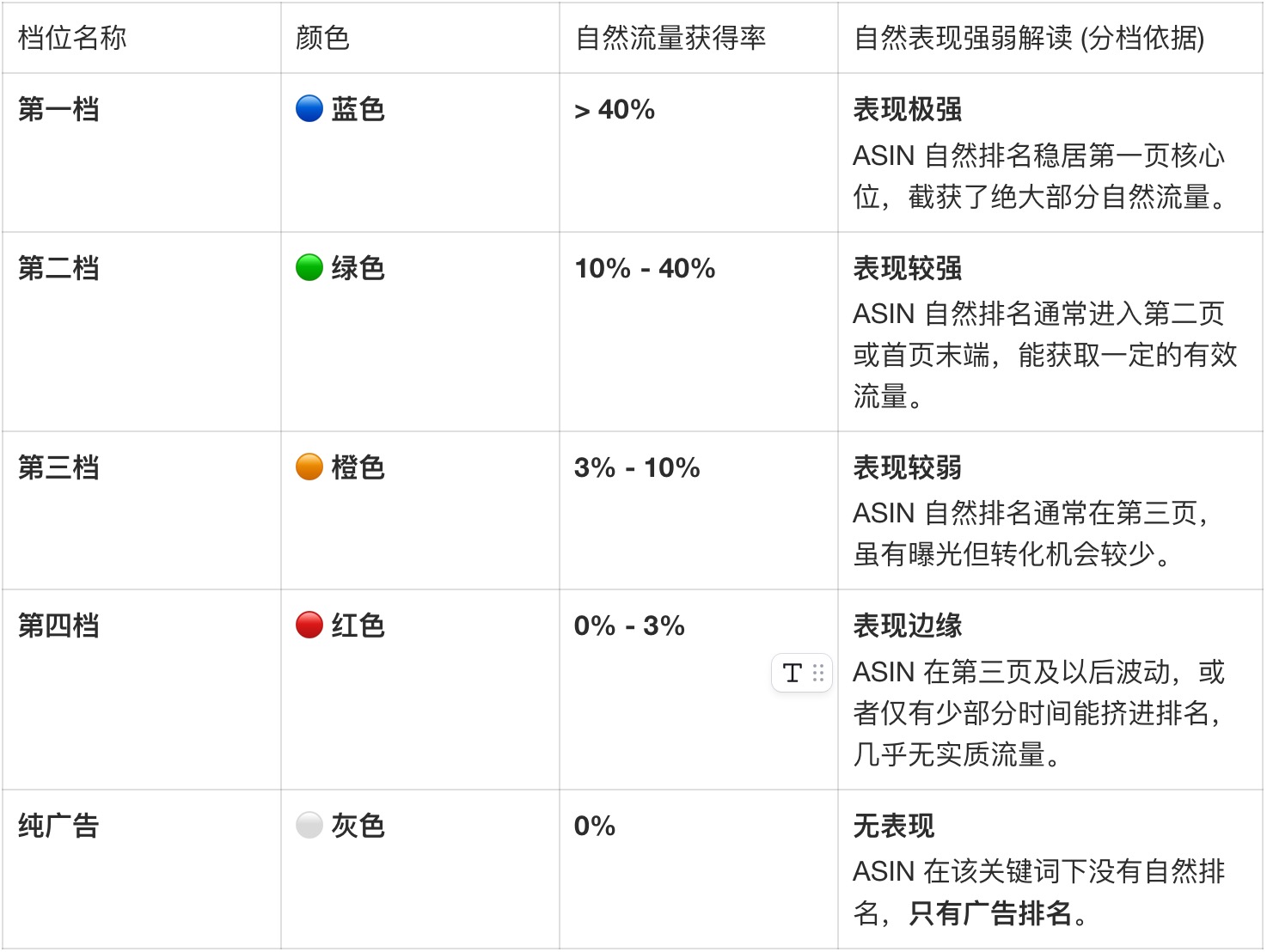 请注意:分档是基于“自然表现”划分的,但得分统计的是“总流量得分”。 我们将 ASIN 在关键词下的每日表现划分为五个“实力档位”。这直接对应了 ASIN 的自然排名位置: