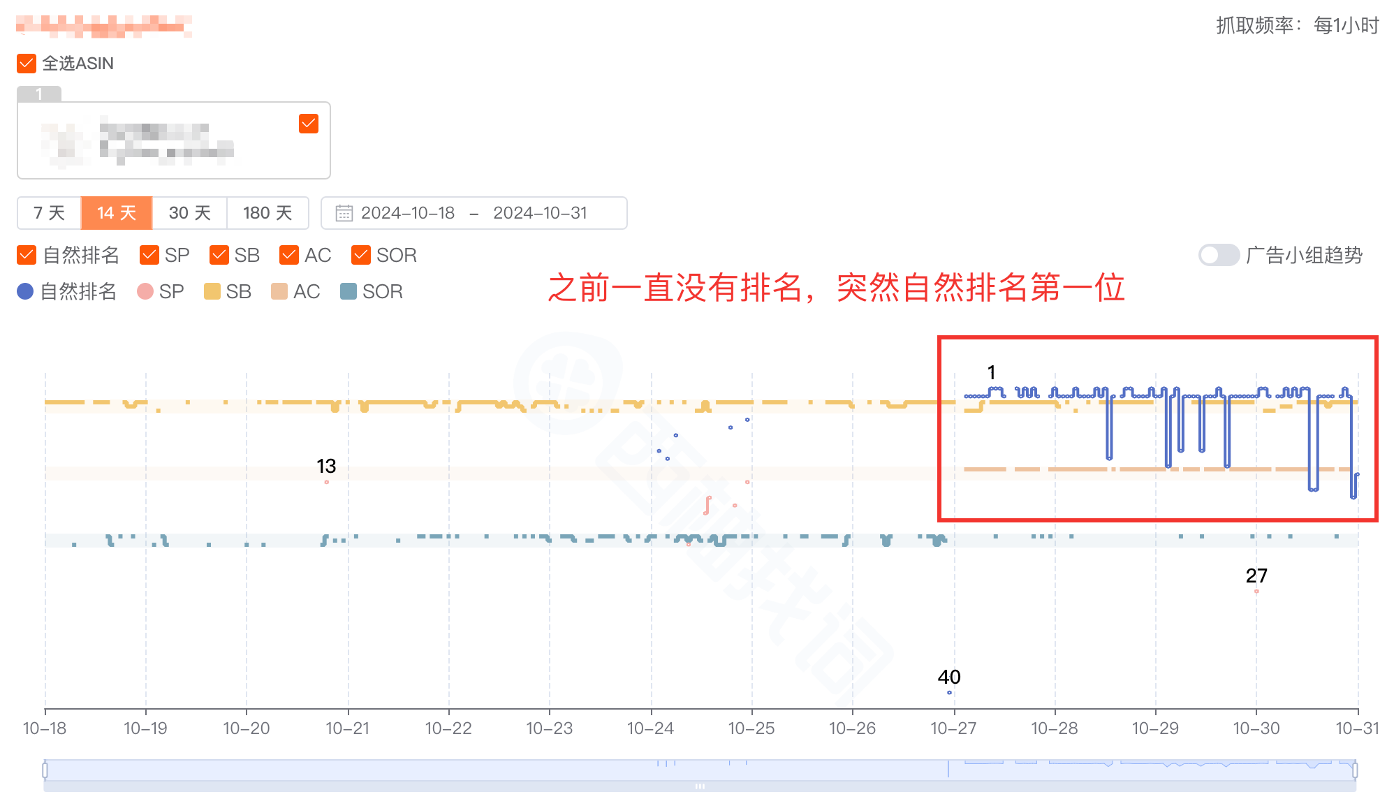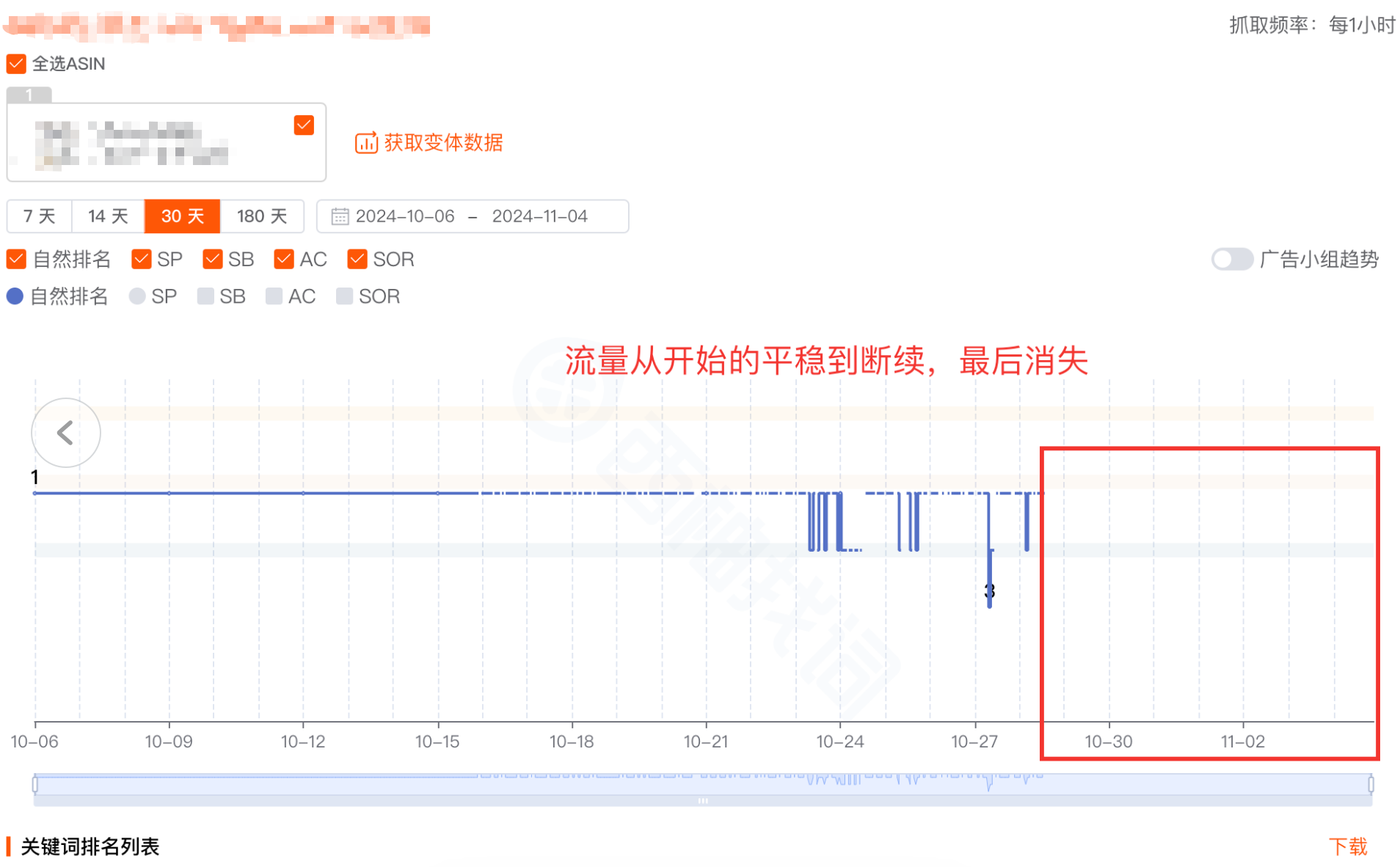 原本自然位稳定在第一名的ASIN,自然位突然消失。