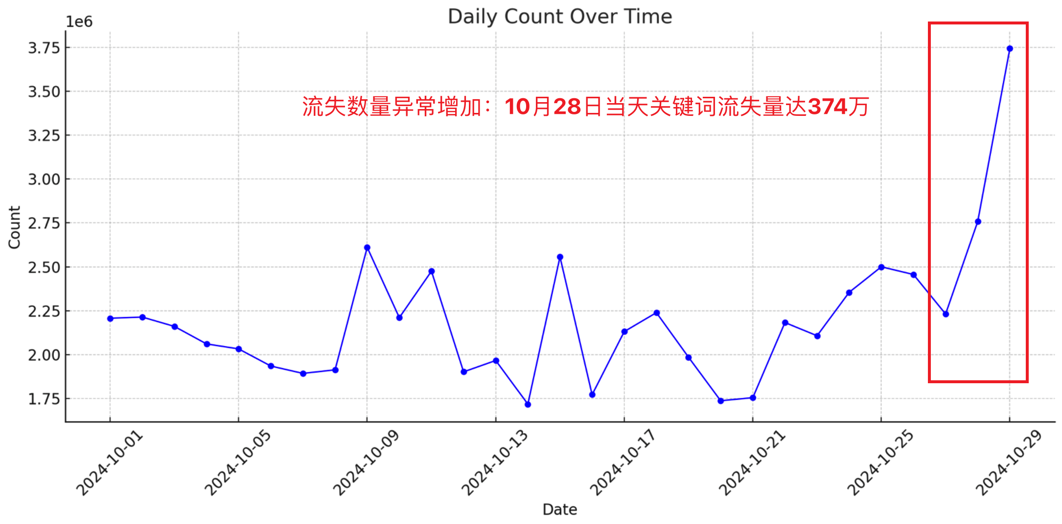 此图表直观反映了关键词自然排名出现异常波动的总体趋势,正常情况下1天的流失量在100--250万之间,但从10月28号开始,自然排名流失量直线上升,流失量高达374万, 由此已经进一步从整理验证了此次异常波动。