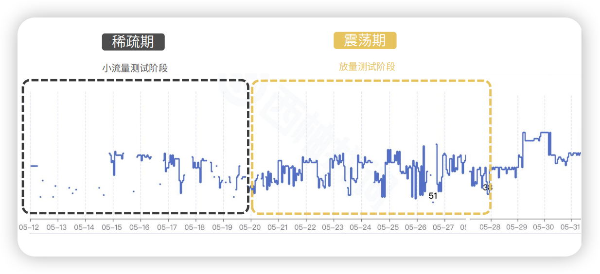 这里借用一下西柚找词之前所提到的流量分配的三个阶段:稀疏期(一天内自然排名比较少且靠后)、震荡期(自然排名上下起伏)、稳定期(自然排名逐渐稳定)能够帮助判断ASIN当前所处的阶段。