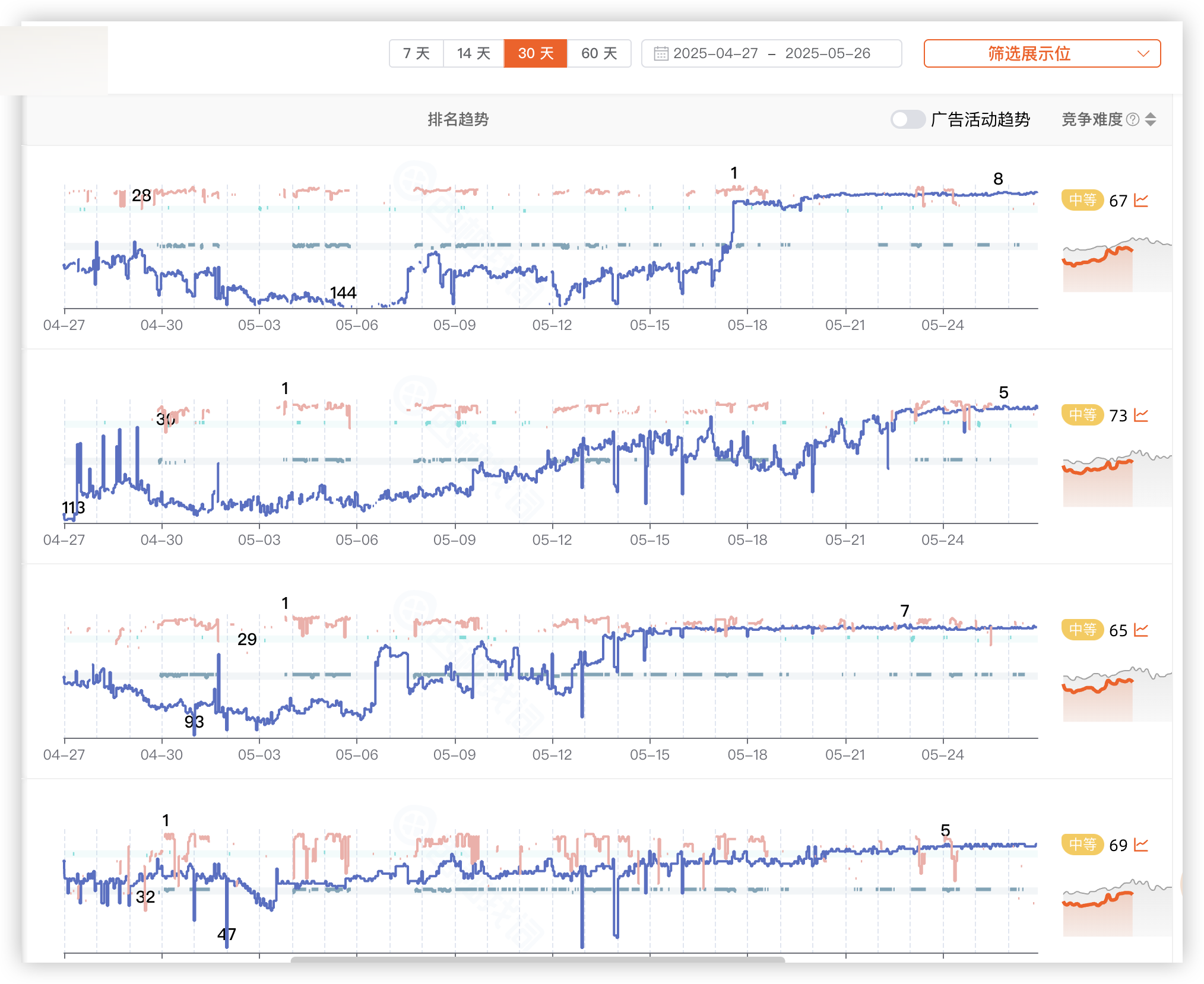 并且最好能够在旺季来临的前1-2个月就尽可能的把自然排名稳定下来,才会有后面和供应链的谈判以及发货库存的安排。要不然数据波动,容易干扰数据判断。