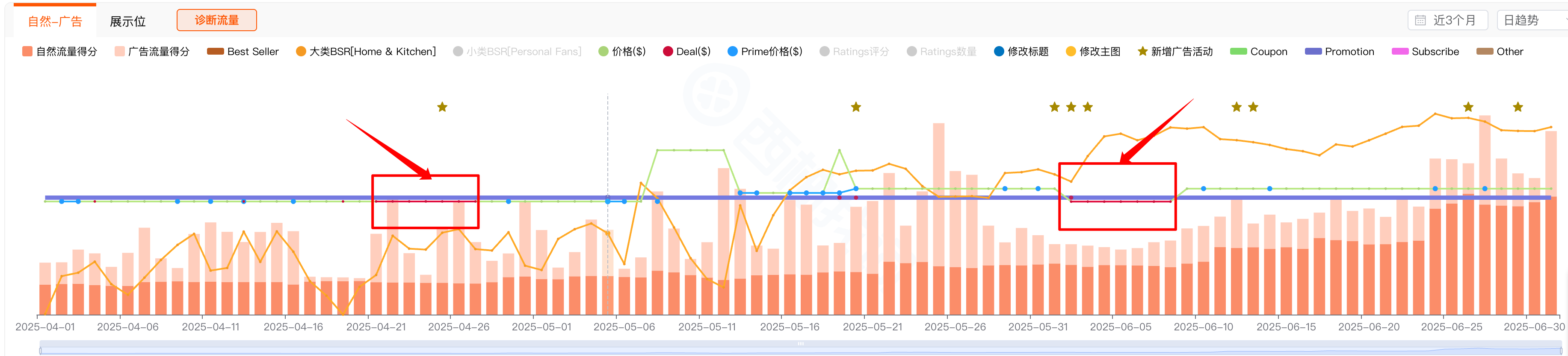 然而自然位又和ASIN在关键词下的点击和转化有关,如果能够很好地判断当前所处的阶段,我们就能够通过一些人为手段(Deal、增加广告投放)去提升点击和曝光。