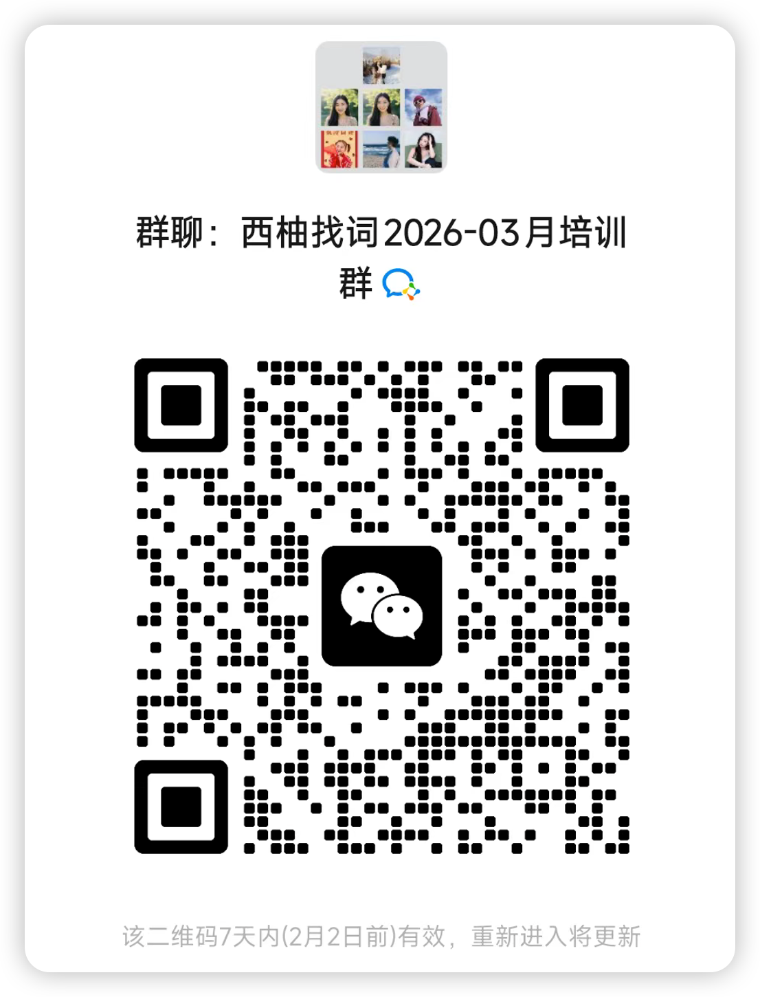 欢迎扫码进群参加西柚找词的03月培训,如群二维码失效,可联系运营顾问,拉您进入培训交流群。