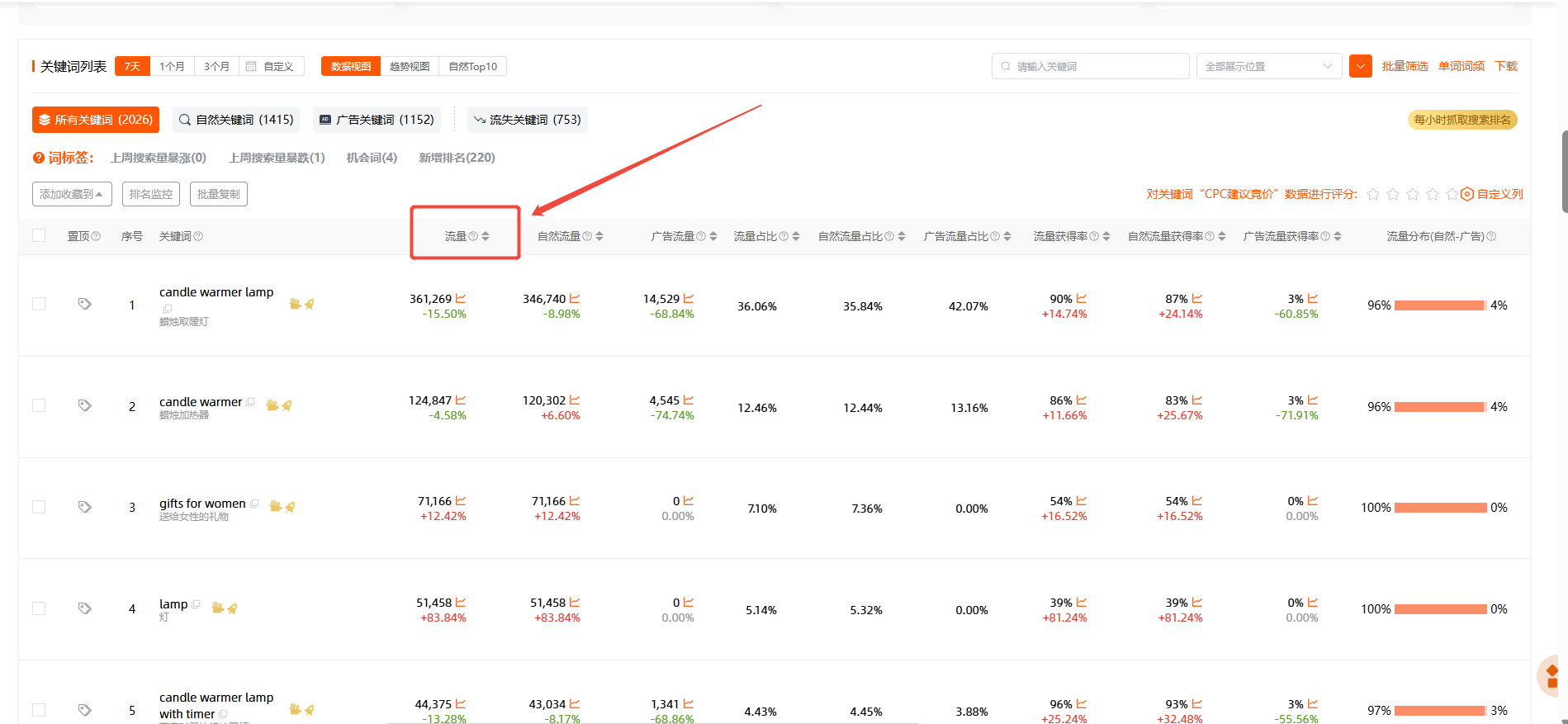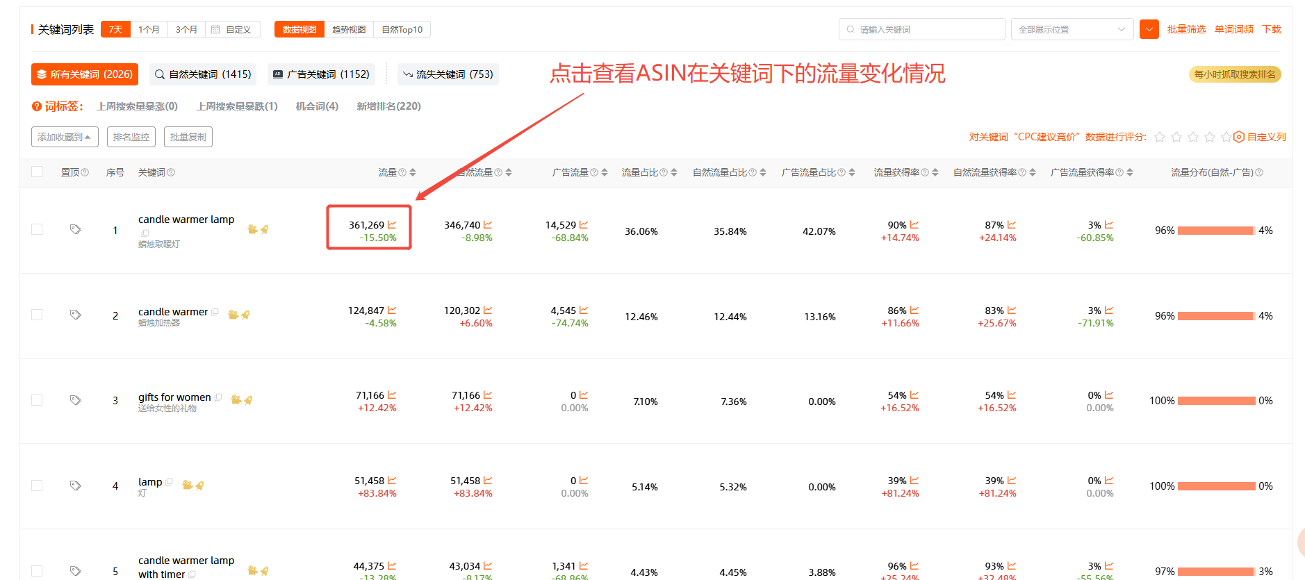 2、点击“流量”,可查看ASIN在关键词下的流量变化情况