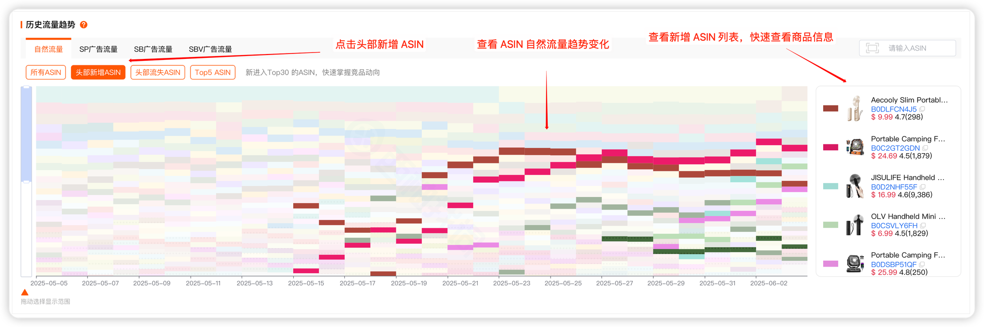了解关键词近期头部新增 ASIN,了解排名变化趋势