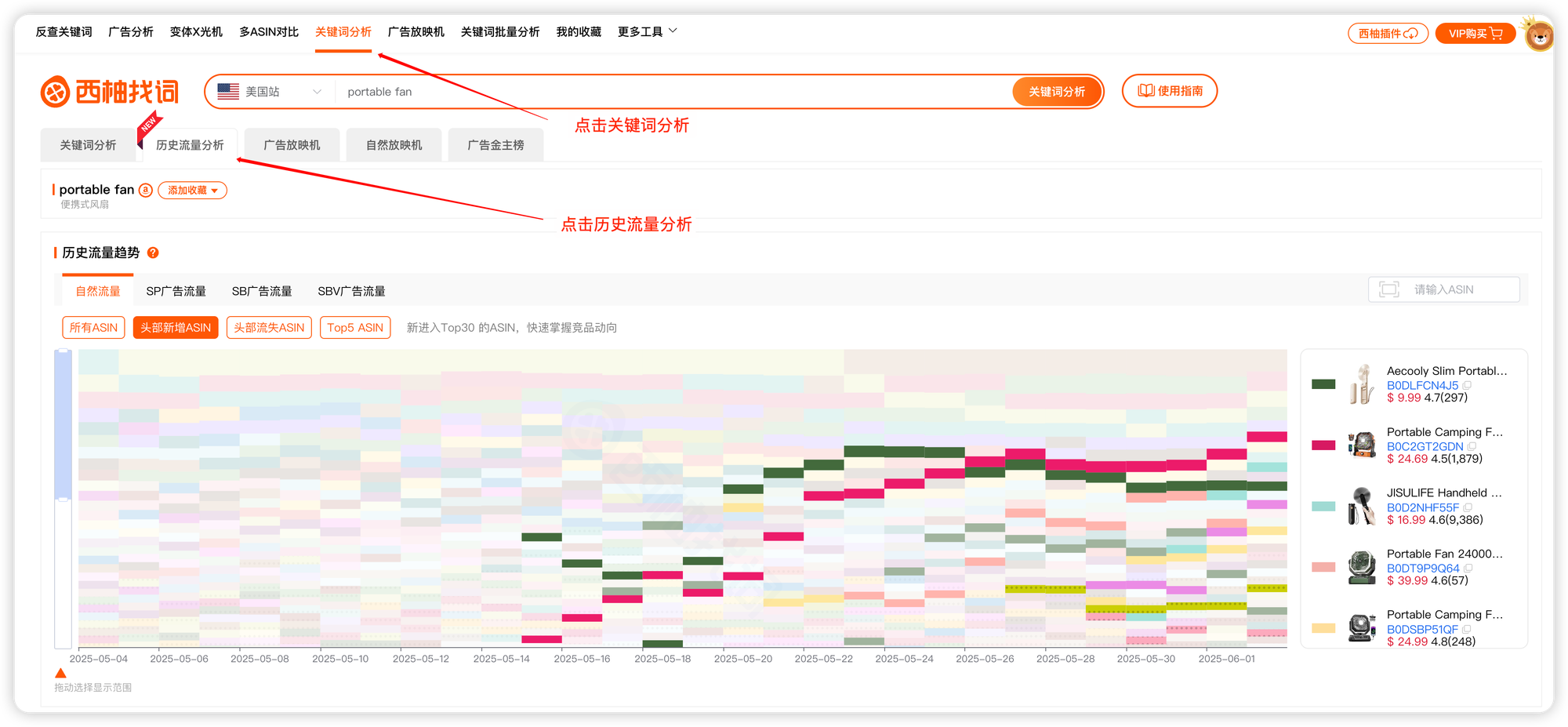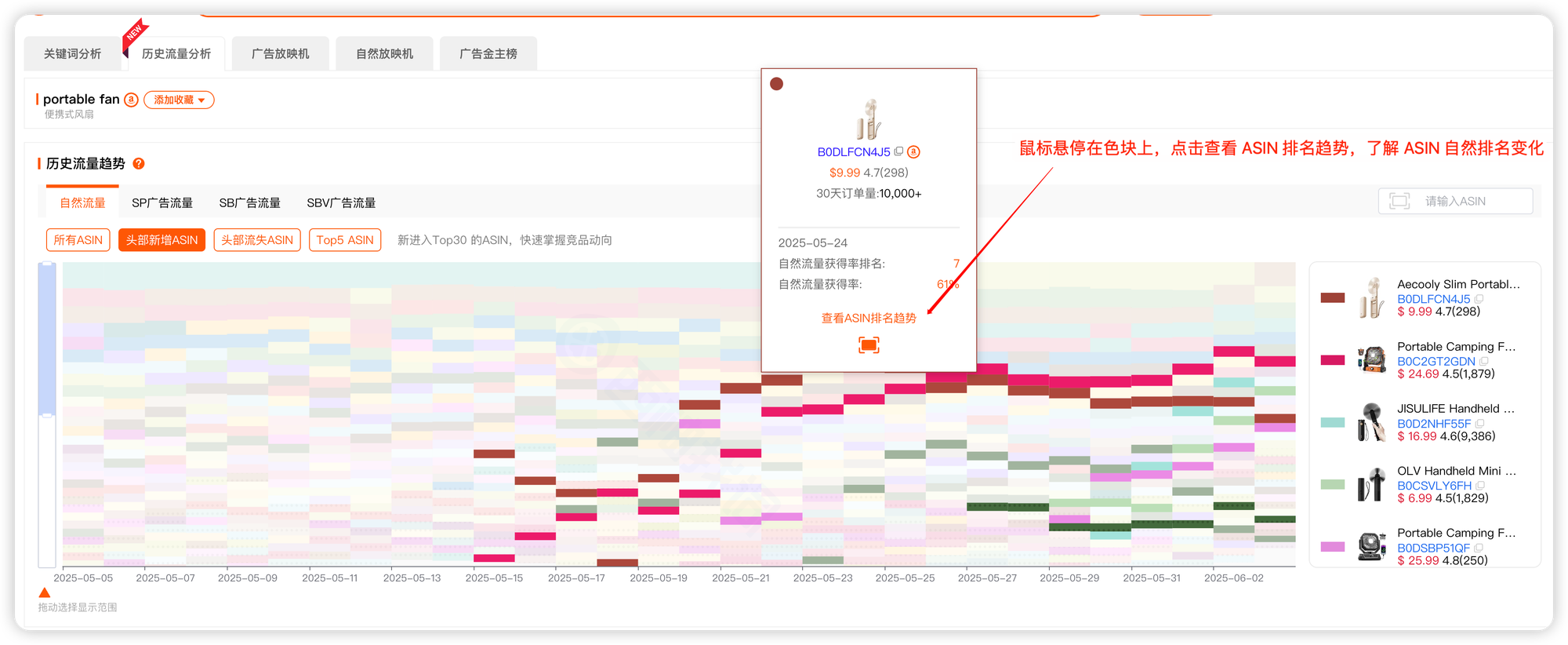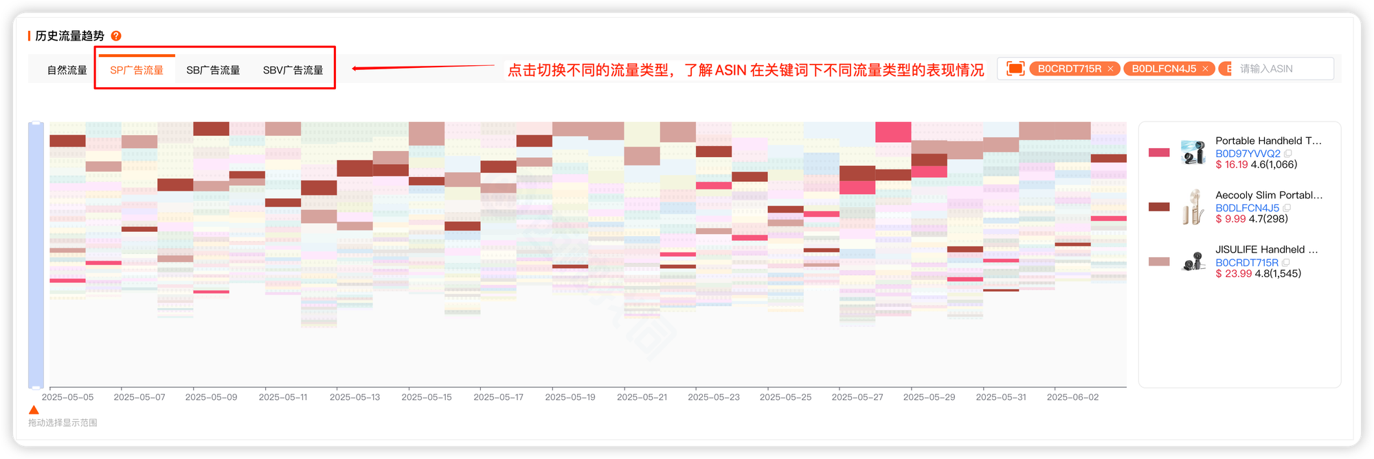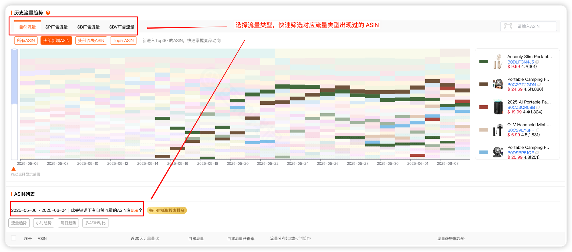 点击切换流量类型,快速筛选关键词下不同流量类型的 ASIN进行分析